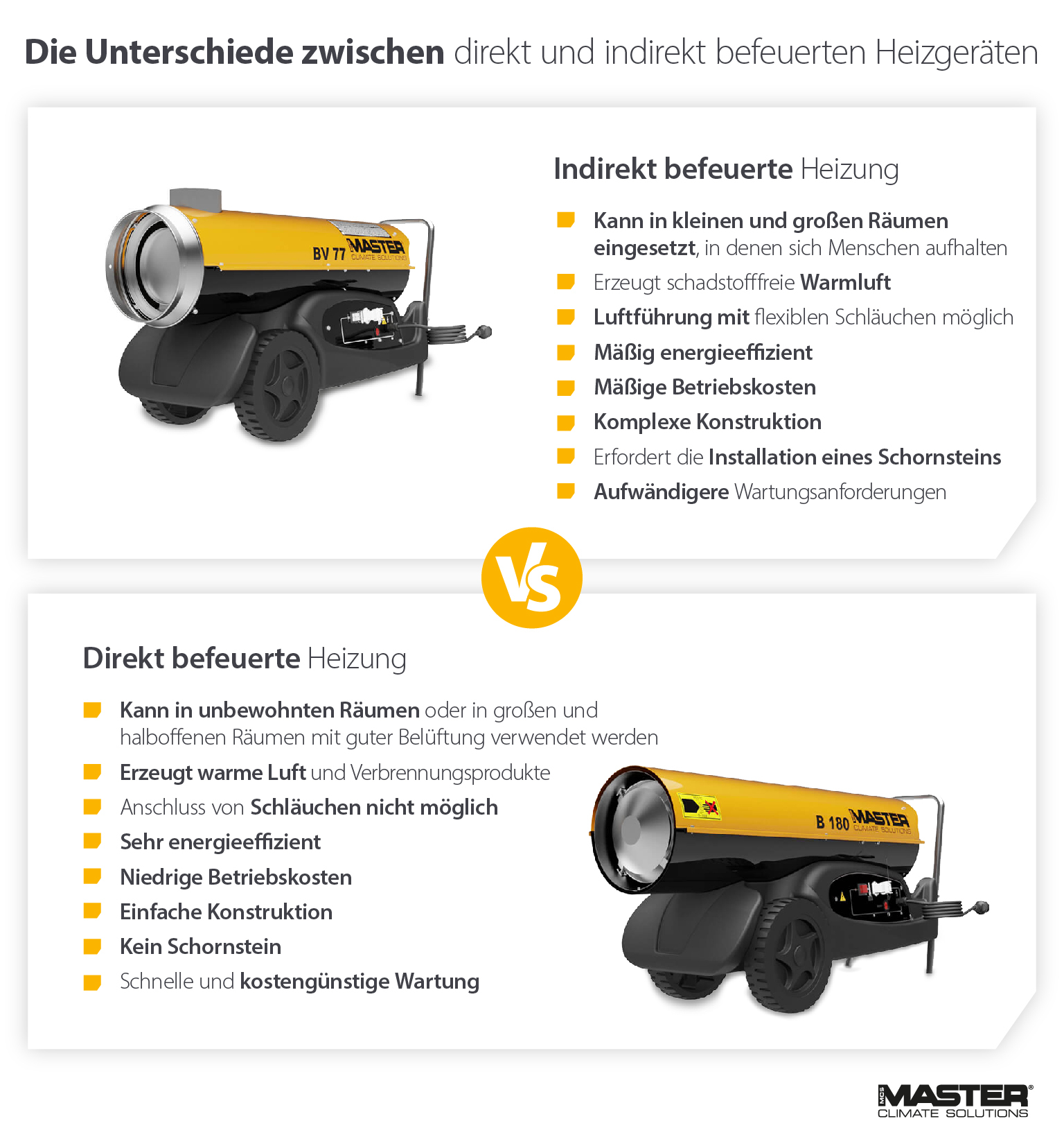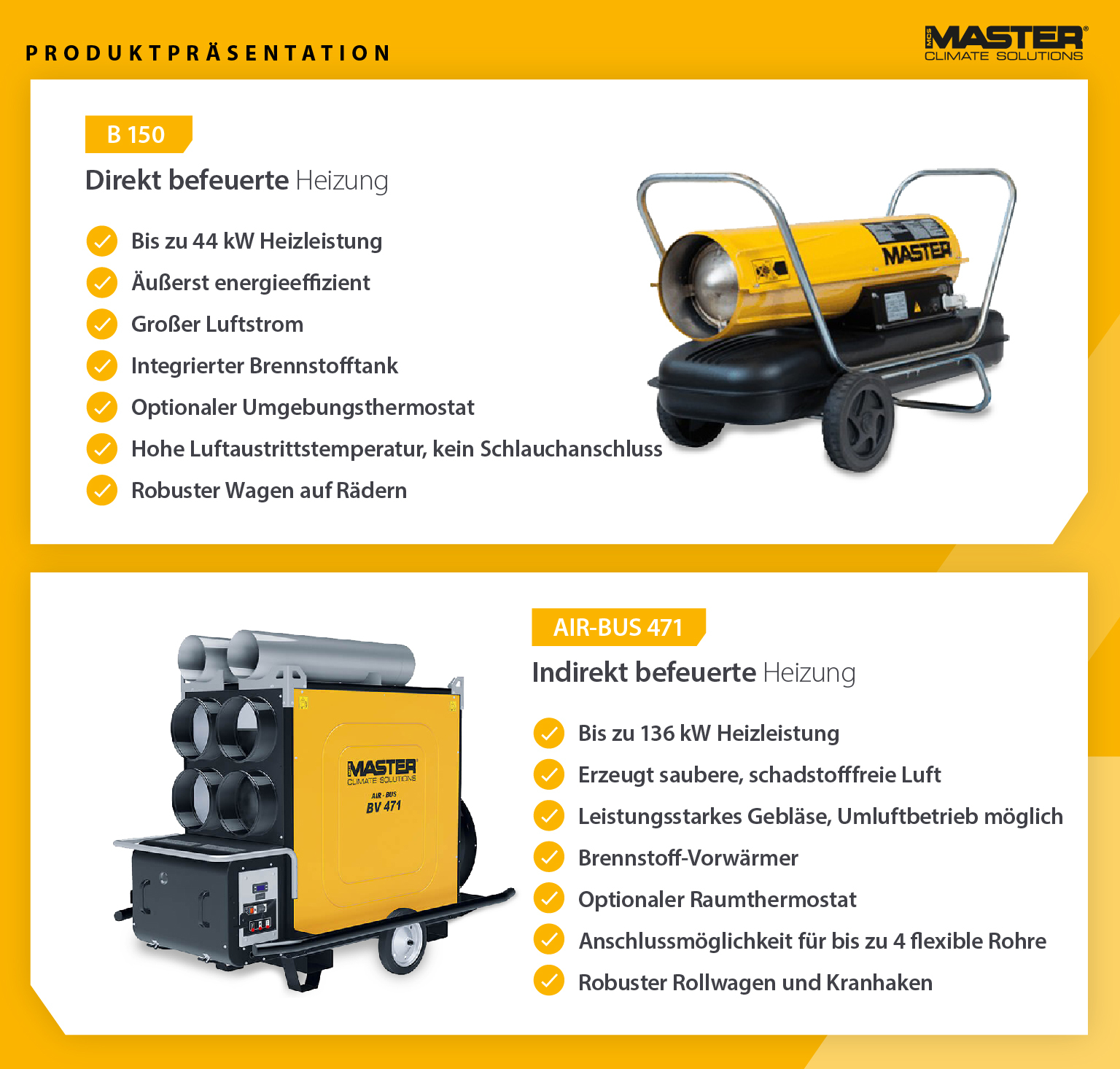 Direkte Heizgeräte von Master sind bekannt für ihre Effizienz, Robustheit, Benutzerfreundlichkeit und Betriebssicherheit.