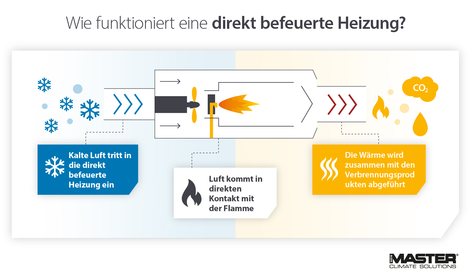 Direkte Heizgeräte arbeiten mit Brennstoffen wie Gas oder Öl, um die Luft zu erwärmen. Zu diesem Zweck erwärmt eine offene Flamme im Inneren des Geräts die einströmende Luft, bevor sie abgeleitet wird, und liefert so schnell eine enorme Heizleistung.