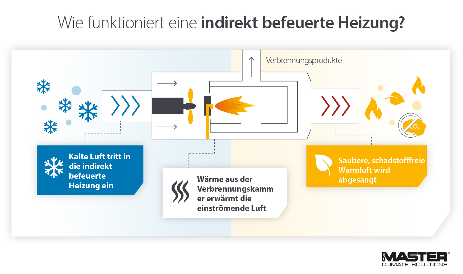 Die indirekten Ölheizgeräte von Master sind hocheffizient und erzeugen 100% saubere, trockene und rauchfreie Warmluft.
