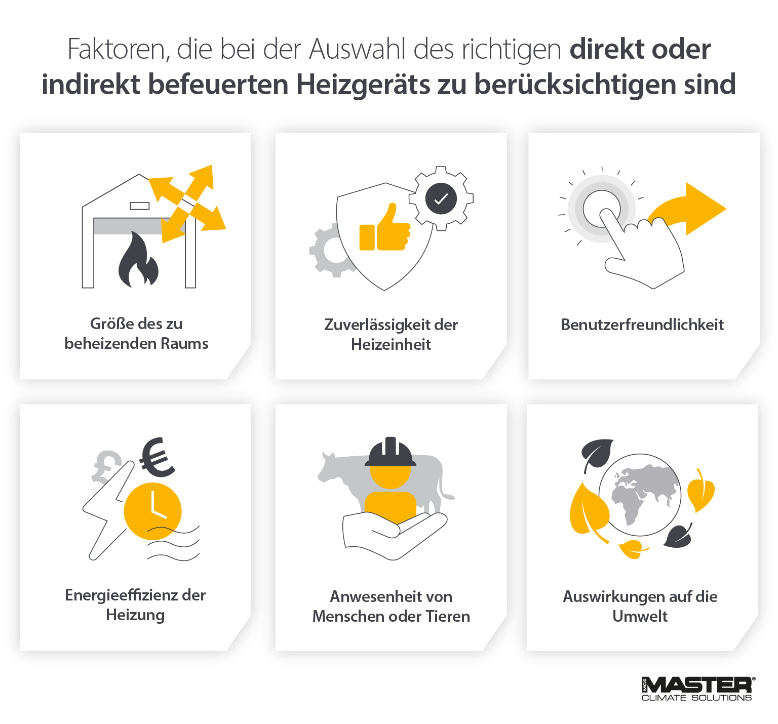 Um Ihnen diese wichtige Entscheidung zu erleichtern, sollten Sie bei der Wahl des richtigen direkten oder indirekten Heizgeräts folgende Faktoren berücksichtigen: