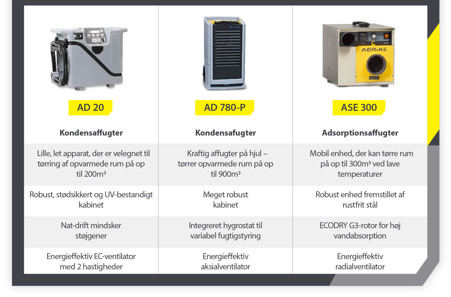 Derfor er det afgørende at være omhyggelig, når der skal vælges det apparat, der egner sig bedst til det pågældende job. Et apparat, der kan være egnet til et større kontorbyggeri eller kældre, er måske ikke egnet til vandskader i f.eks. et bade-, sove- eller opholdsrum.