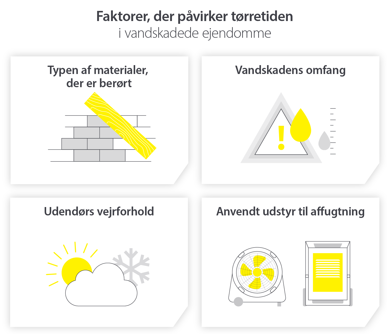 Det er dog vigtigt at anvende en affugtningsløsning sammen med øget ventilation for at sikre, at det vand, der fordamper fra beskadigede materialer, opfanges, og at det ikke kondenserer på underlag eller genstande, når luftcirkulationen ophører.