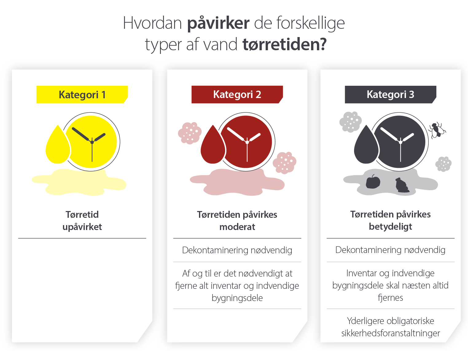 Den indvirkning, som disse forskellige vandkategorier kan have på et projekts tidslinje, kan være betydelig. Mens vand i kategori 1 er den enkleste og hurtigste type fugt at fjerne, komplicerer vand i kategori 2 og 3 projekterne og vil tage længere tid at håndtere.