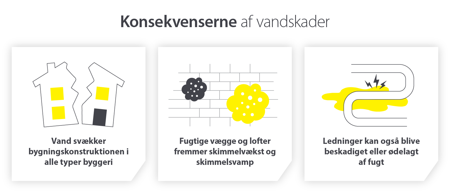 Ud over at gennemvæde materialer som trægulve eller isolering kan vand skabe ubehagelige levevilkår, erodere strukturer og forringe en ejendoms integritet og sikkerhed indefra og ud.