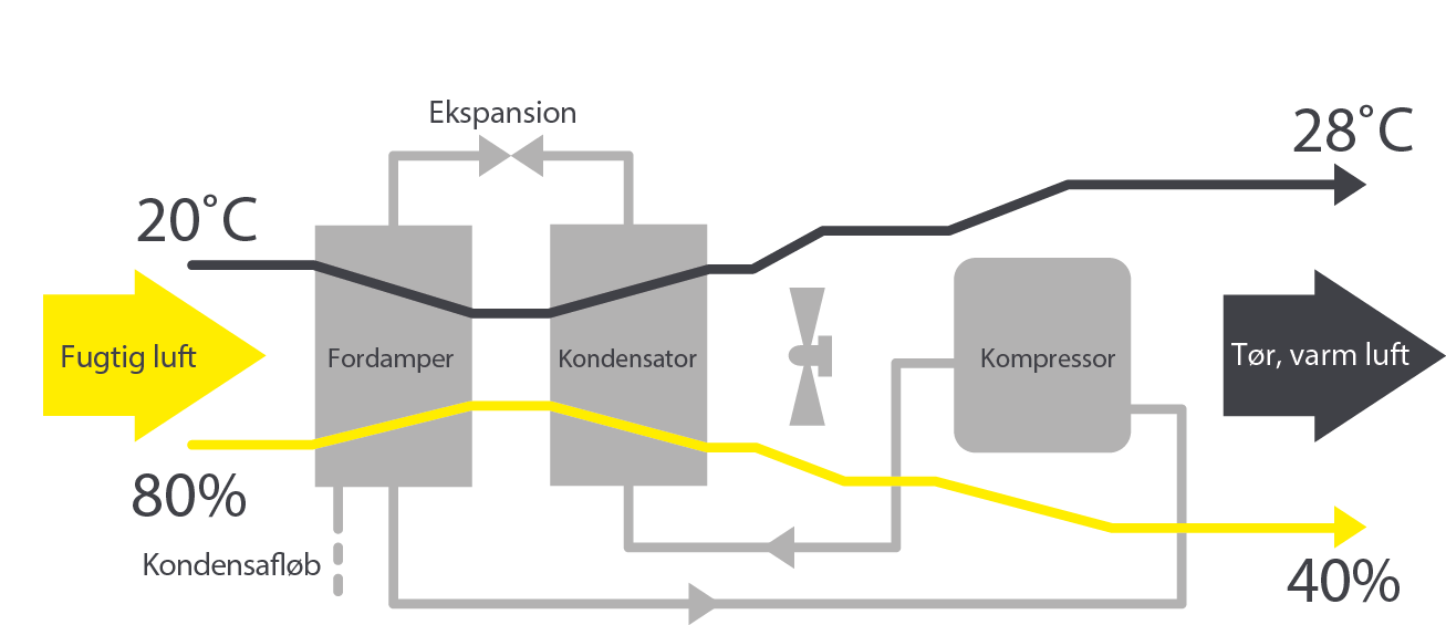 Den varme, tørre luft returneres derefter til rummet ved den ønskede luftfugtighed