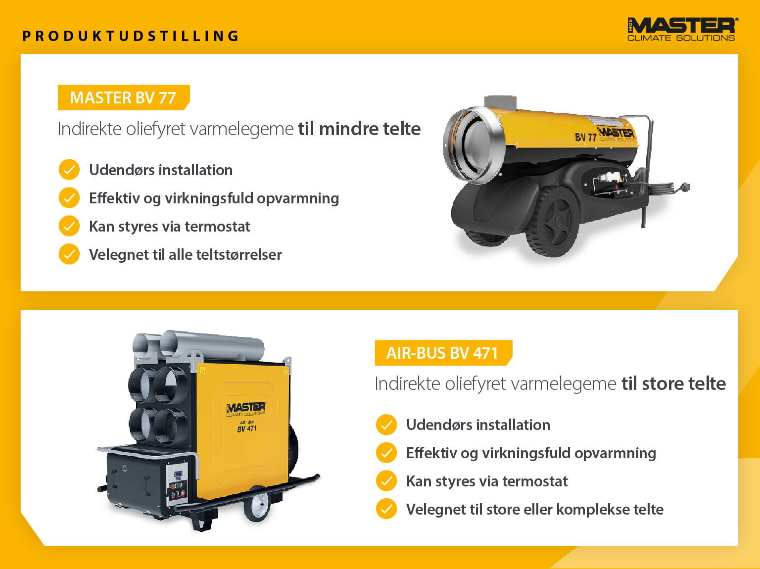 Mange professionelle brugere og velgørenhedsorganisationer har i årtier haft tillid til Master-varmeapparater til effektiv opvarmning af telte. Vi producerer en række kraftfulde apparater, der passer til forskellige miljøer.