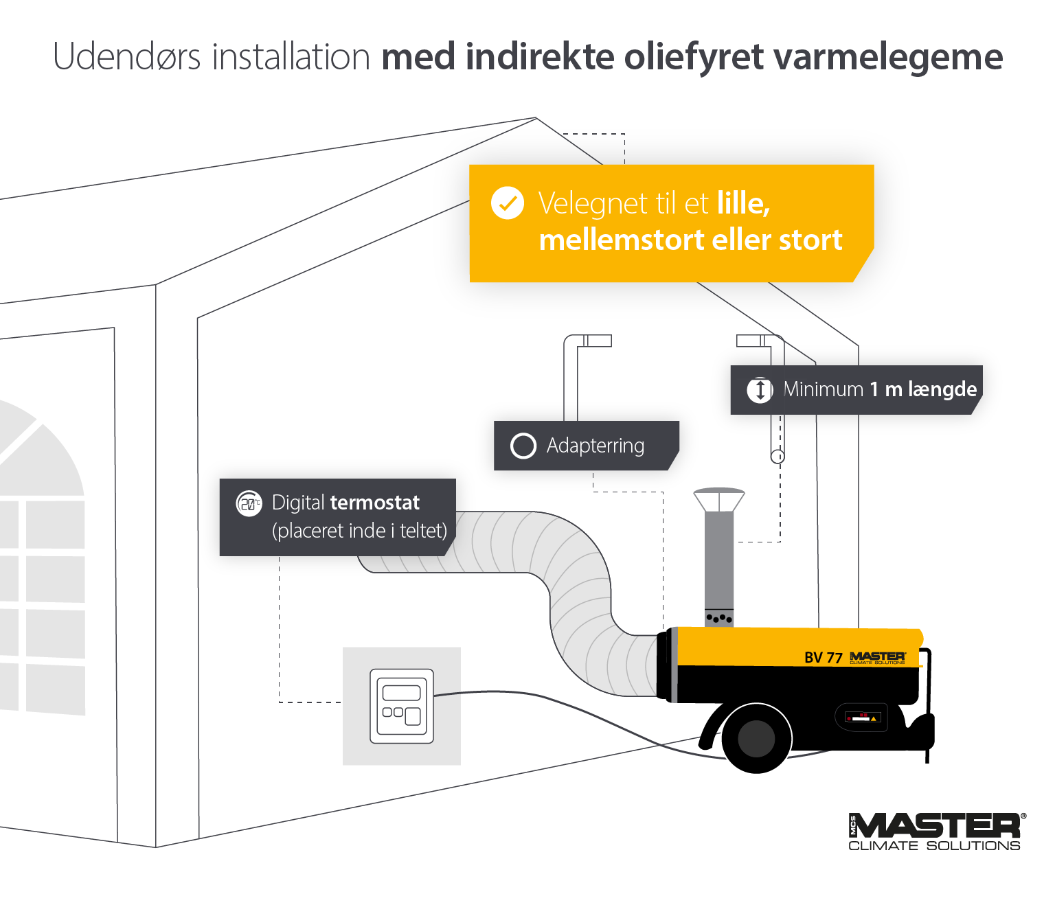 Vores indirekte oliefyrede varmeapparater er det mest populære valg til midlertidige konstruktioner og opvarmning af telte. De opvarmer effektivt rummet, mens selve apparatet kan placeres uden for konstruktionen, hvilket betyder, at der ikke er støj eller afbrydelser.