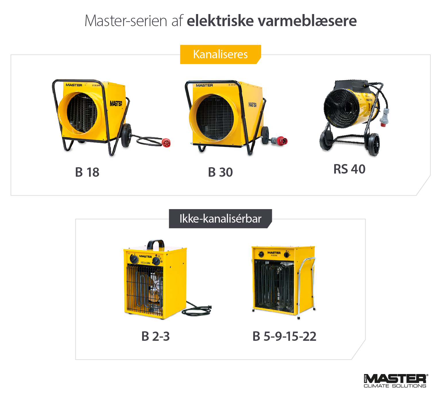 Varmekapaciteten for Masters elektriske varmeapparater går fra 2 kW til 40 kW. For apparater på 5 kW og derover skal du have adgang til en trefaset strømforsyning.