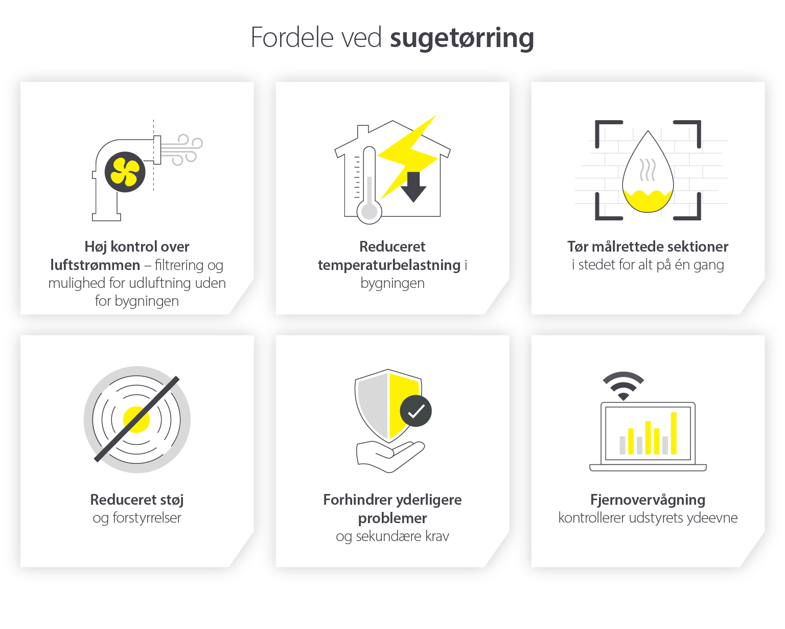 Sugetørring er endnu engang en løsning på denne typiske begrænsning, som en tørreentreprenør står over for, da den spildvarme, der genereres af systemet motor, kan afluftes uden for bygningen sammen med vådluften fra konstruktionen.