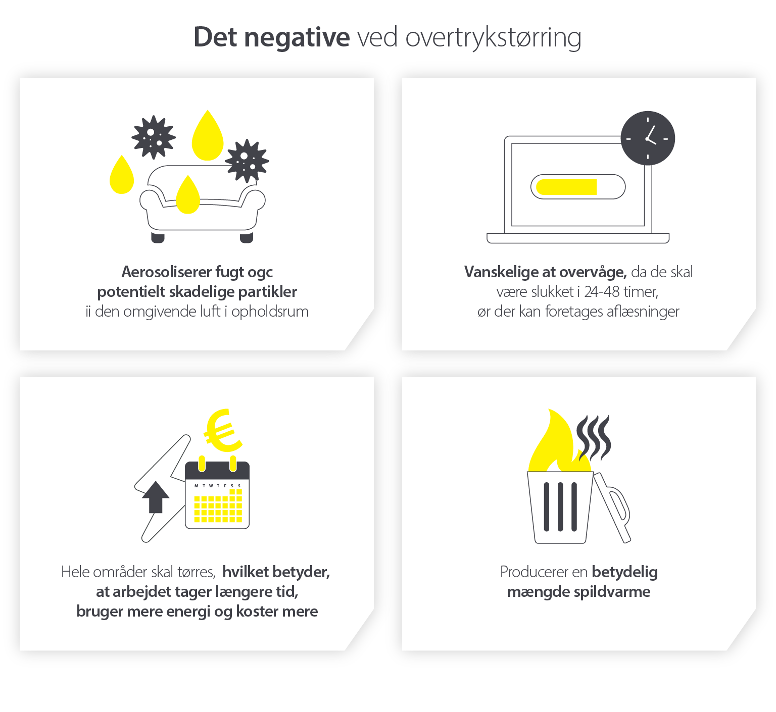 Installationer med overtryk kan ofte være ret vanskelige at overvåge, da de typisk skal lukkes ned i 24-48 timer, før der kan foretages målinger – på hvilket tidspunkt det kan besluttes, om tørringen skal fortsættes, eller om projektet skal godkendes som afsluttet. Denne nedetid indebærer en omkostning for alle projektets interessenter.