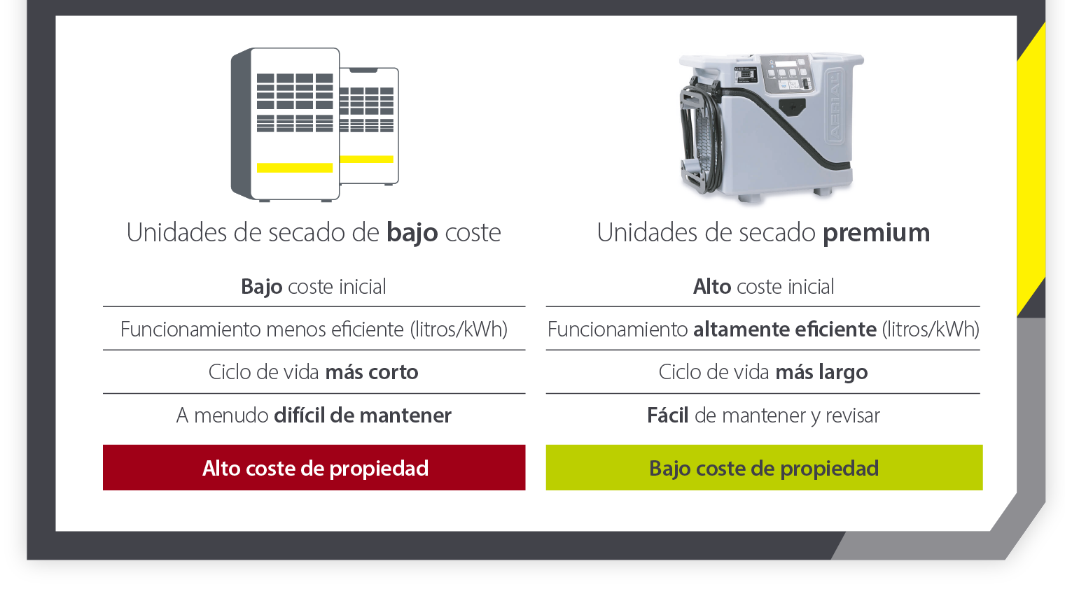 Del mismo modo, aunque comprar unidades de secado baratas y de baja calidad puede suponer un ahorro a corto plazo, a largo plazo serán más caras de utilizar y mantener, y tendrán una vida útil más corta. Comprar calidad desde el principio le ahorrará más en los meses y años venideros.