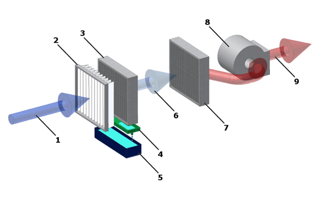 1 – filtre ; 2 – air humide ; 3 – rotor ; 4 – air déshumidifié ; 5 – ventilateur d’extraction ; 6 – air de régénération ; 7 – réchauffeur ; 8 – air chaud de régénération ; 9 – air humide de régénération.