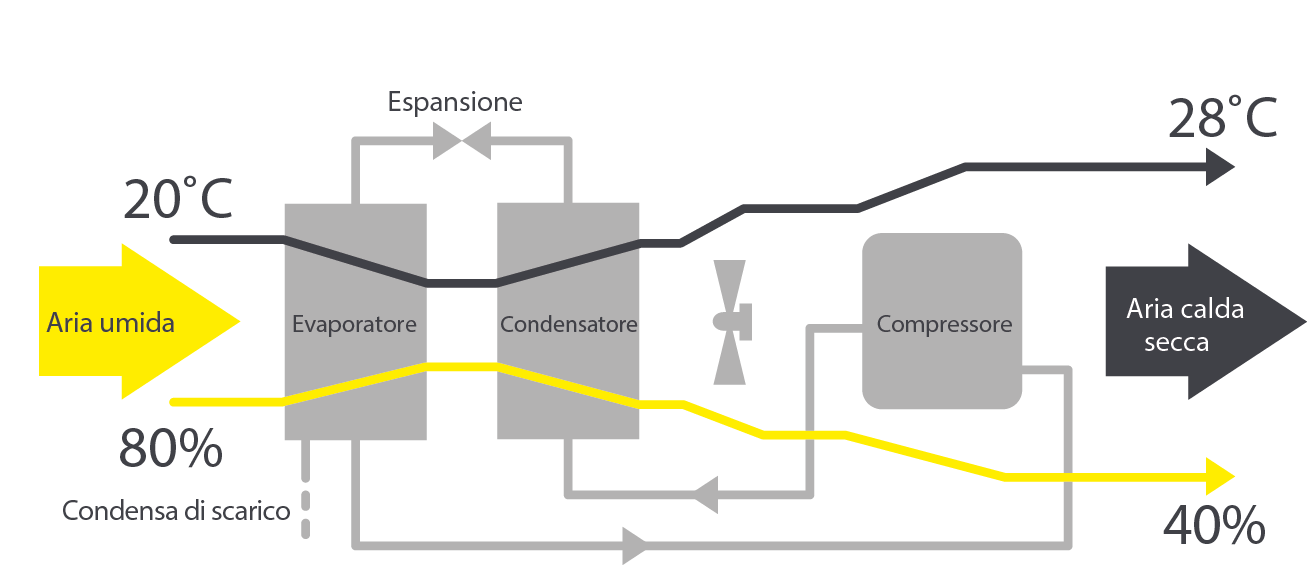 L'aria raffreddata passa attraverso il condensatore e viene riscaldata nuovamente