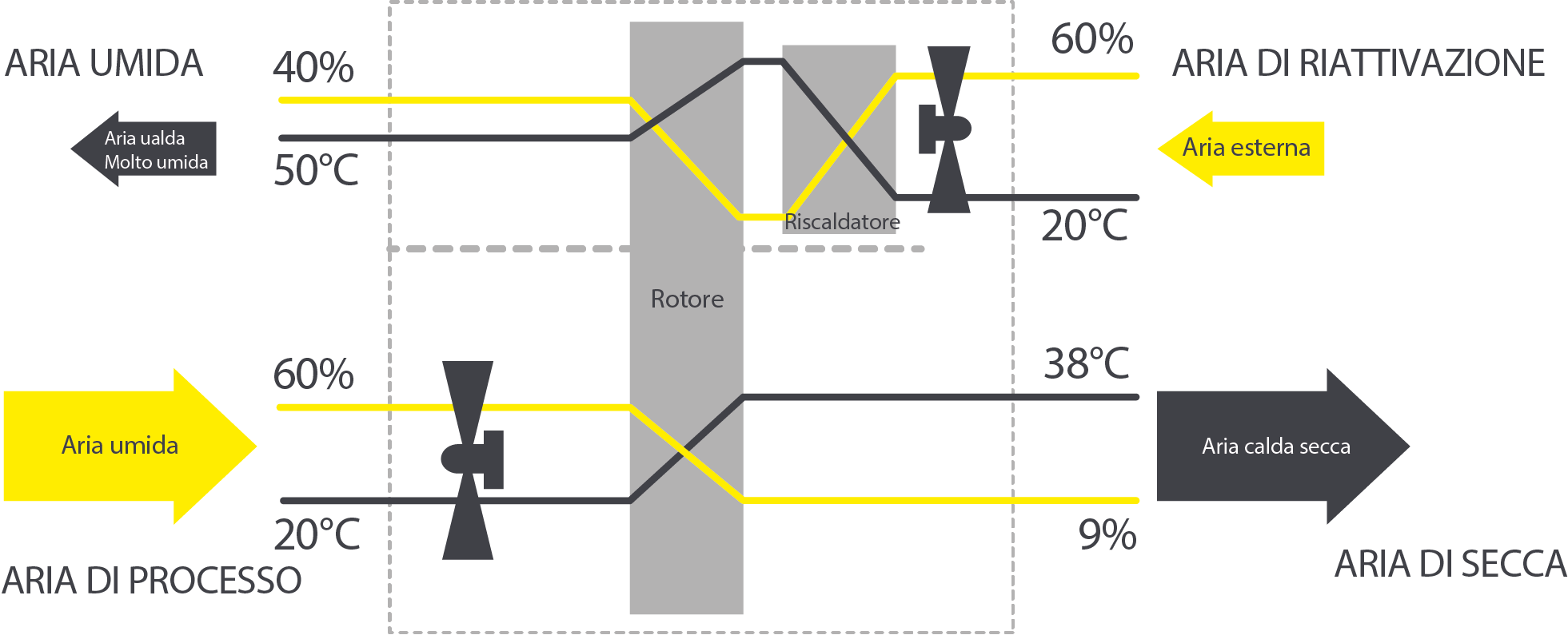 L'aria umida proveniente dall'ambiente viene attirata nella ruota di assorbimento. Il gel di silice assorbe l'umidità e rilascia circa il 75% dell'aria calda e secca.