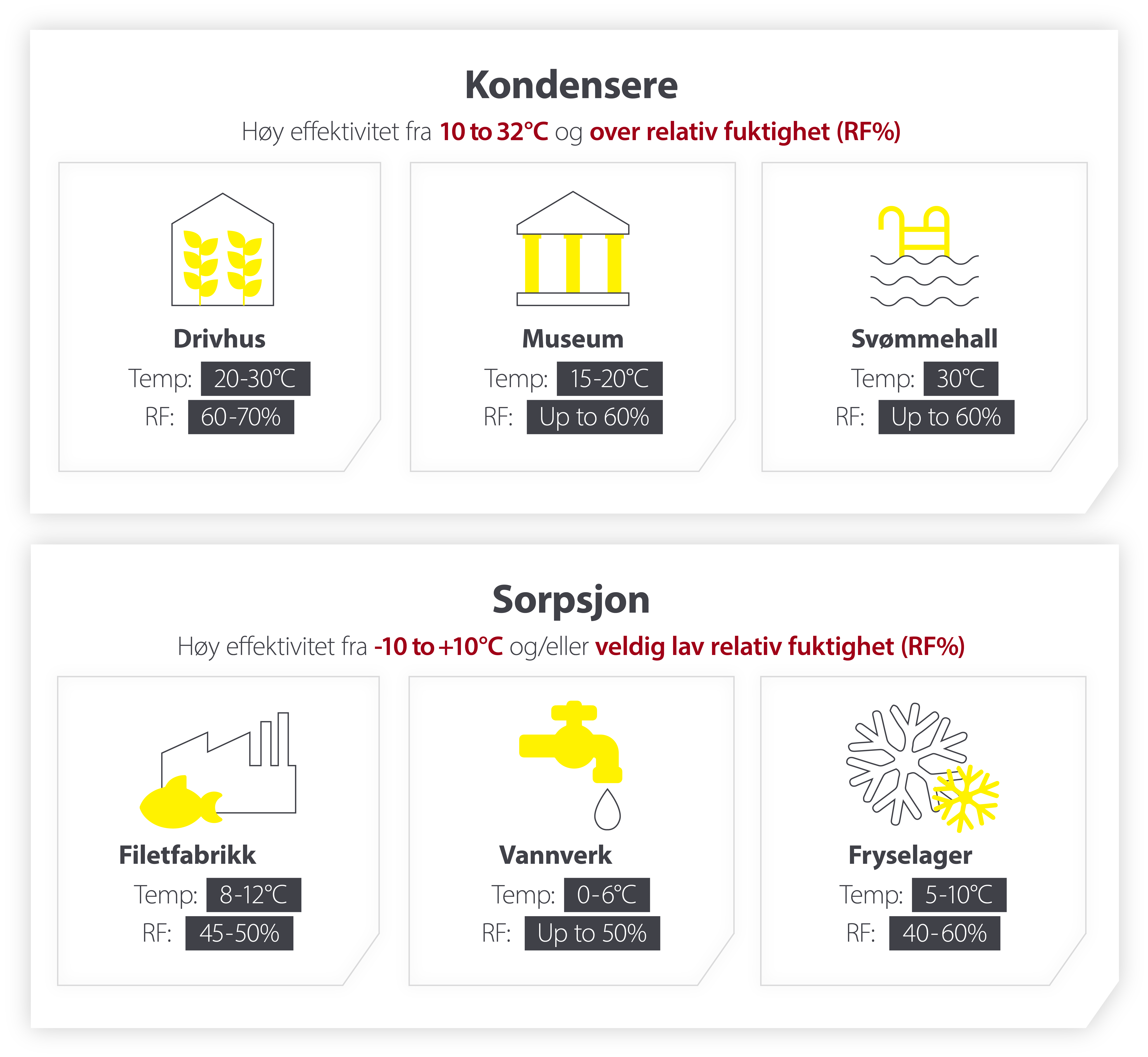 Derfor starter vi alltid med temperaturen og det nødvendige RH-nivået. Nedenfor er noen vanlige eksempler på hvordan temperatur og relativ fuktighet kan avgjøre hvilken teknologi du skal velge: