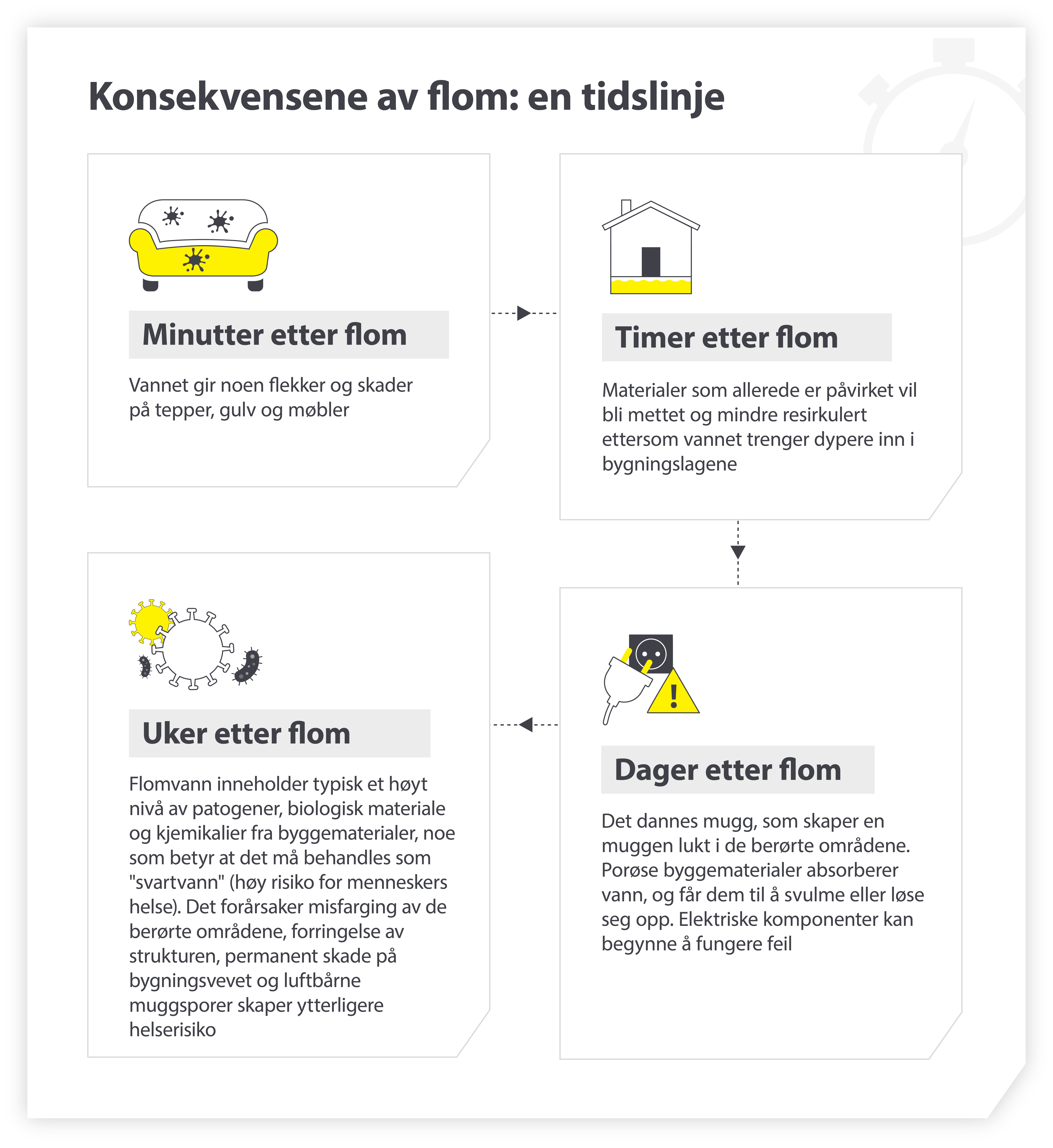 Uansett om det er stående vann i vegghulrommene og fundamentet på en eiendom som til slutt fører til ytterligere skade og kostbare reparasjoner, eller faren for at mugg og bakterier sprer seg og setter helsen til de som bor eller arbeider der i fare, kan de langsiktige konsekvensene av en oversvømmelse bli store.