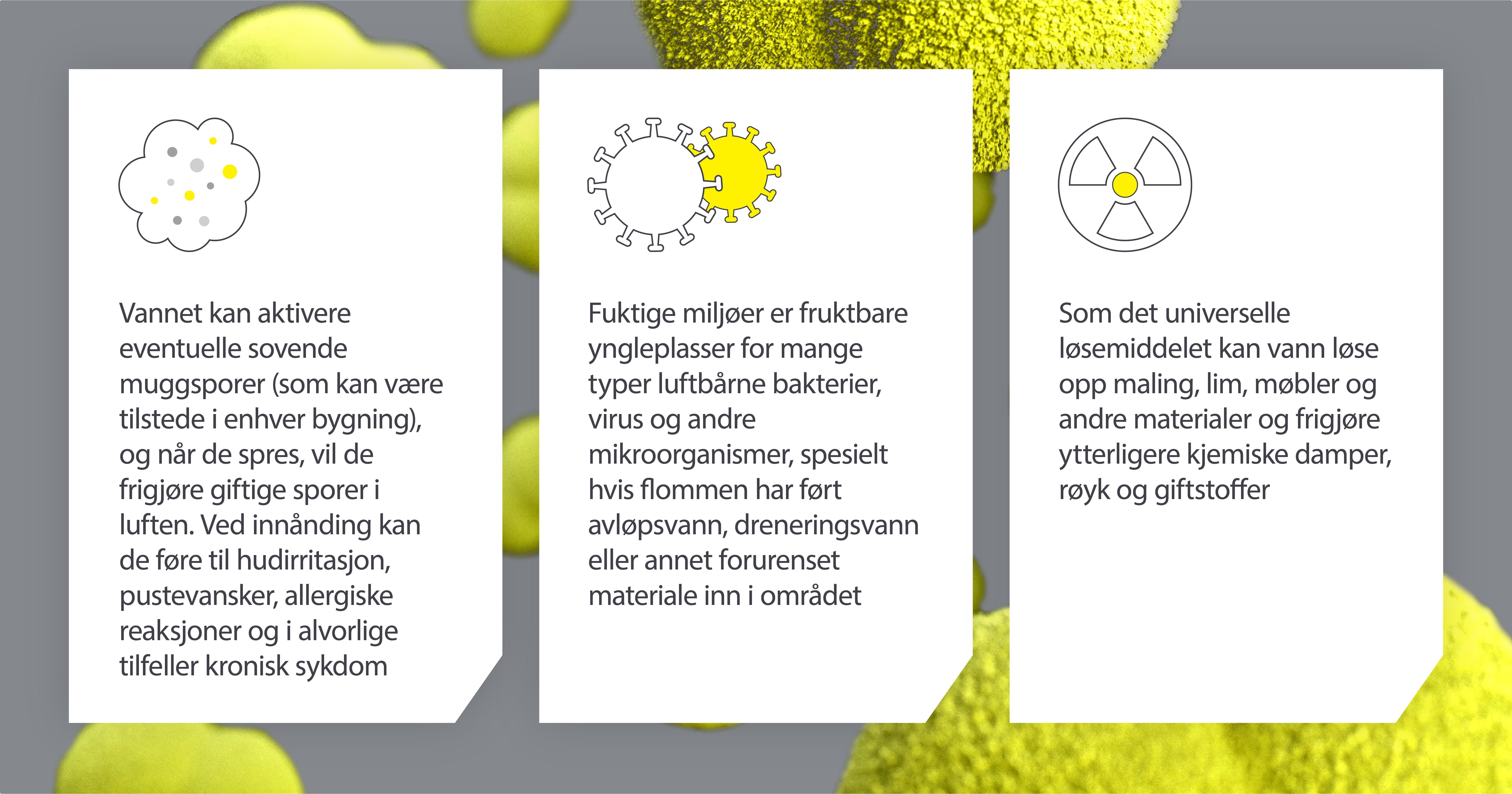 Jo lengre tid fuktigheten får på å trekke inn i møbler og byggematerialer, desto større er risikoen for at muggen formerer seg. Når dette skjer, kan giftstoffer, bakterier og patogener snart komme inn i atmosfæren, og i løpet av dager eller uker utgjør området en betydelig helserisiko. Ved oversvømmelse er eiendommen nesten helt sikkert sterkt forurenset av flomvannet fra dag én.