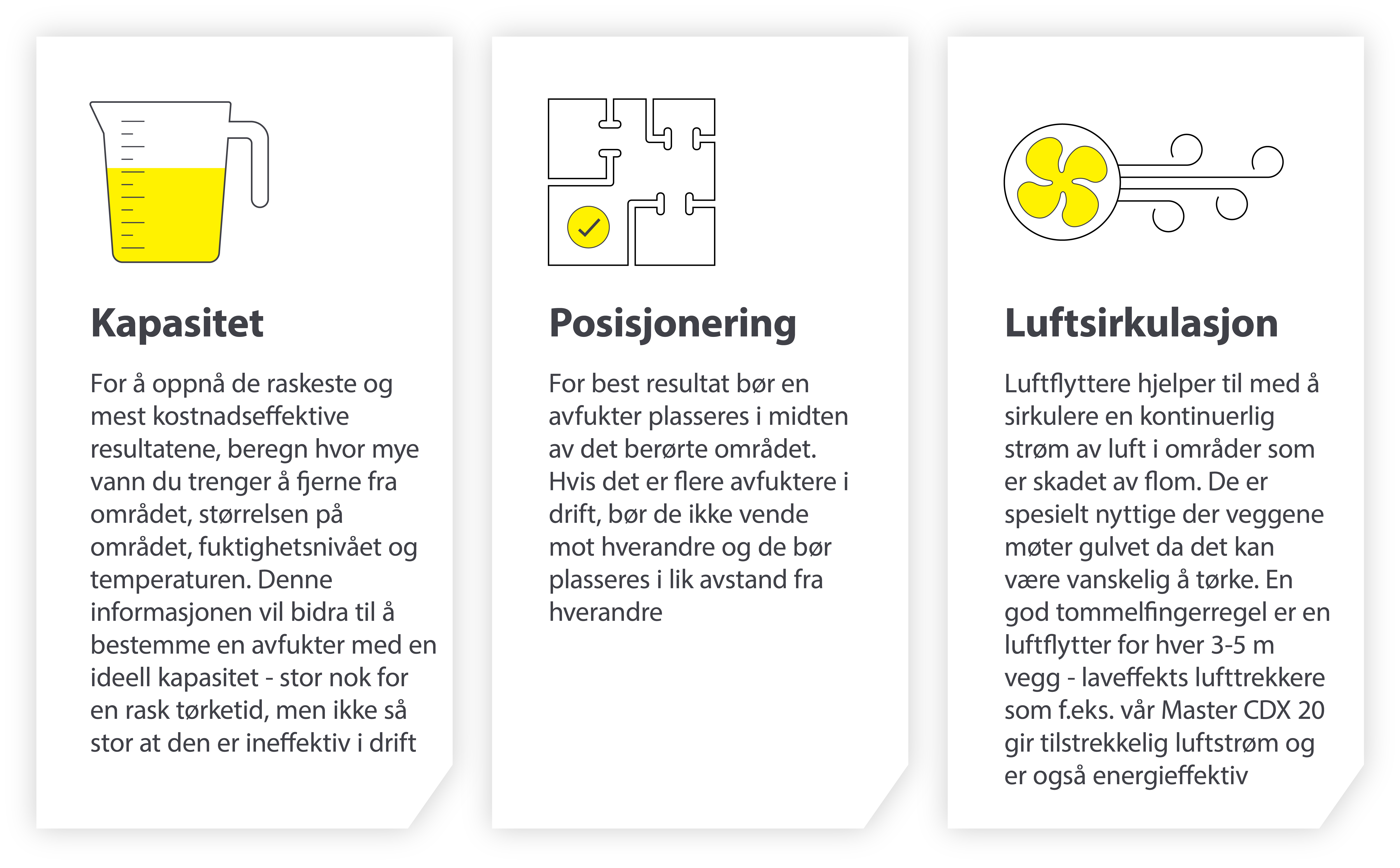 Deretter handler det om å velge riktig avfuktingsløsning og sette den opp på riktig måte for å oppnå best mulig resultat. Tre viktige ting å tenke på her er: