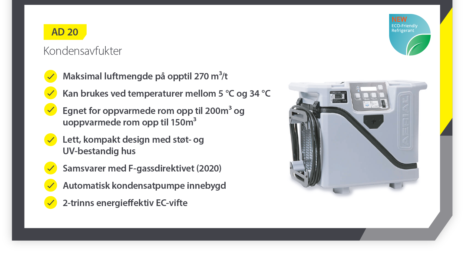 Enheter som AD 20 er ikke bare effektive kondensavfuktere, de er også enkle å vedlikeholde, bygget for å vare og svært energieffektive – ideelle for mange situasjoner.