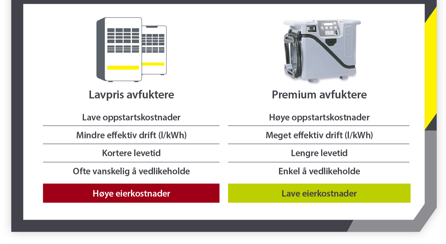 Tilsvarende, mens kjøp av lavkost, lavkvalitets tørkeenheter kan gi kortsiktige besparelser, vil disse på lang sikt være dyrere å drifte og vedlikeholde, og ha kortere levetid. Å kjøpe kvalitet fra første stund vil spare deg mer i månedene og årene fremover.
