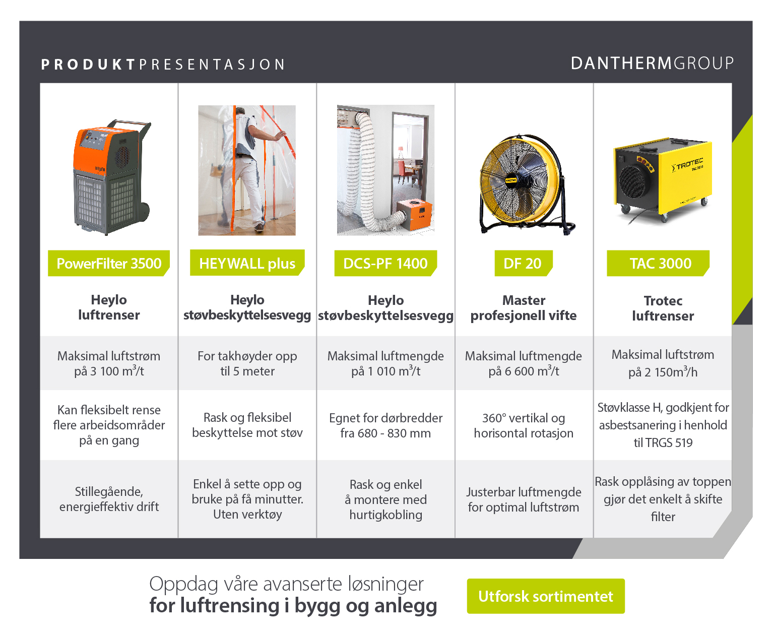Fra praktiske luftskrubbere til brukervennlige støvbeskyttelsesvegger - Dantherm Group er Europas fremste leverandør av teknologi for støvkontroll i byggebransjen. Våre luftrenseløsninger er anerkjent over hele verden og brukes aktivt i utallige prosjekter.