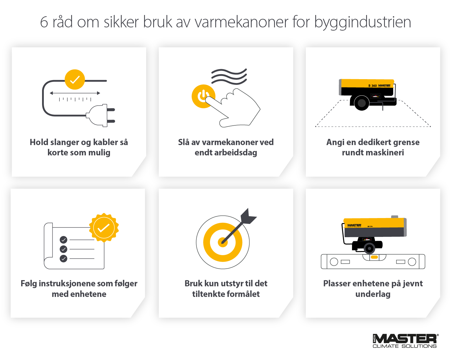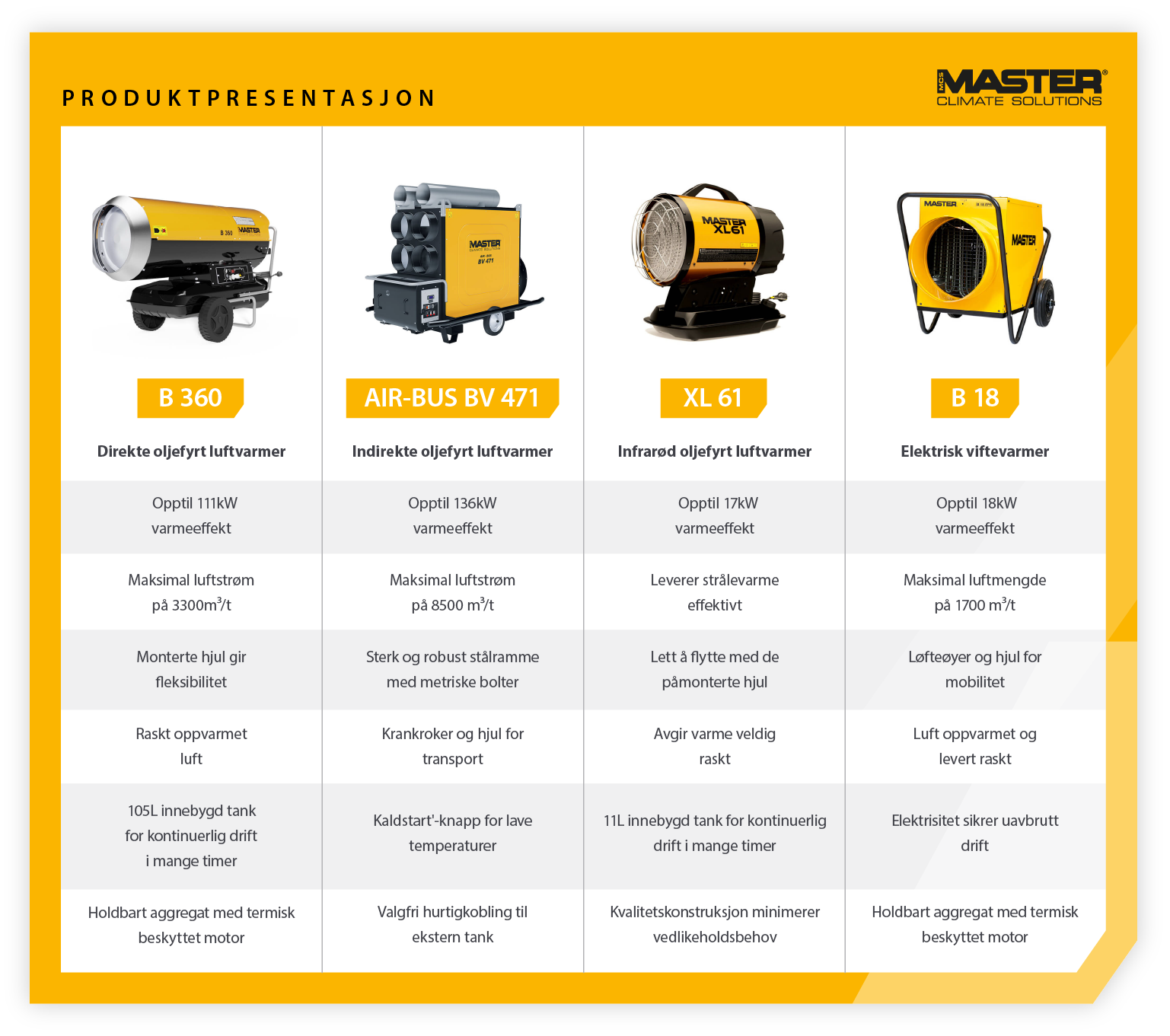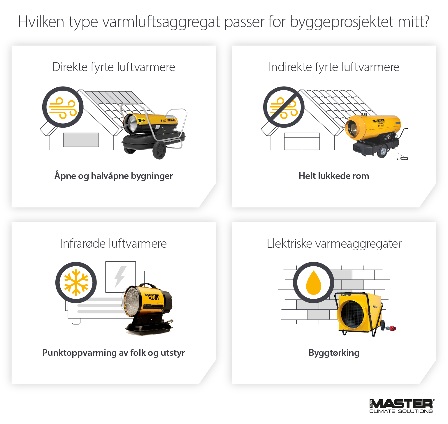 I tillegg til over 70 års erfaring har Master et bredt utvalg av varmluftsaggregater av høy kvalitet for nesten alle scenarier eller prosjekter, både innendørs og utendørs.