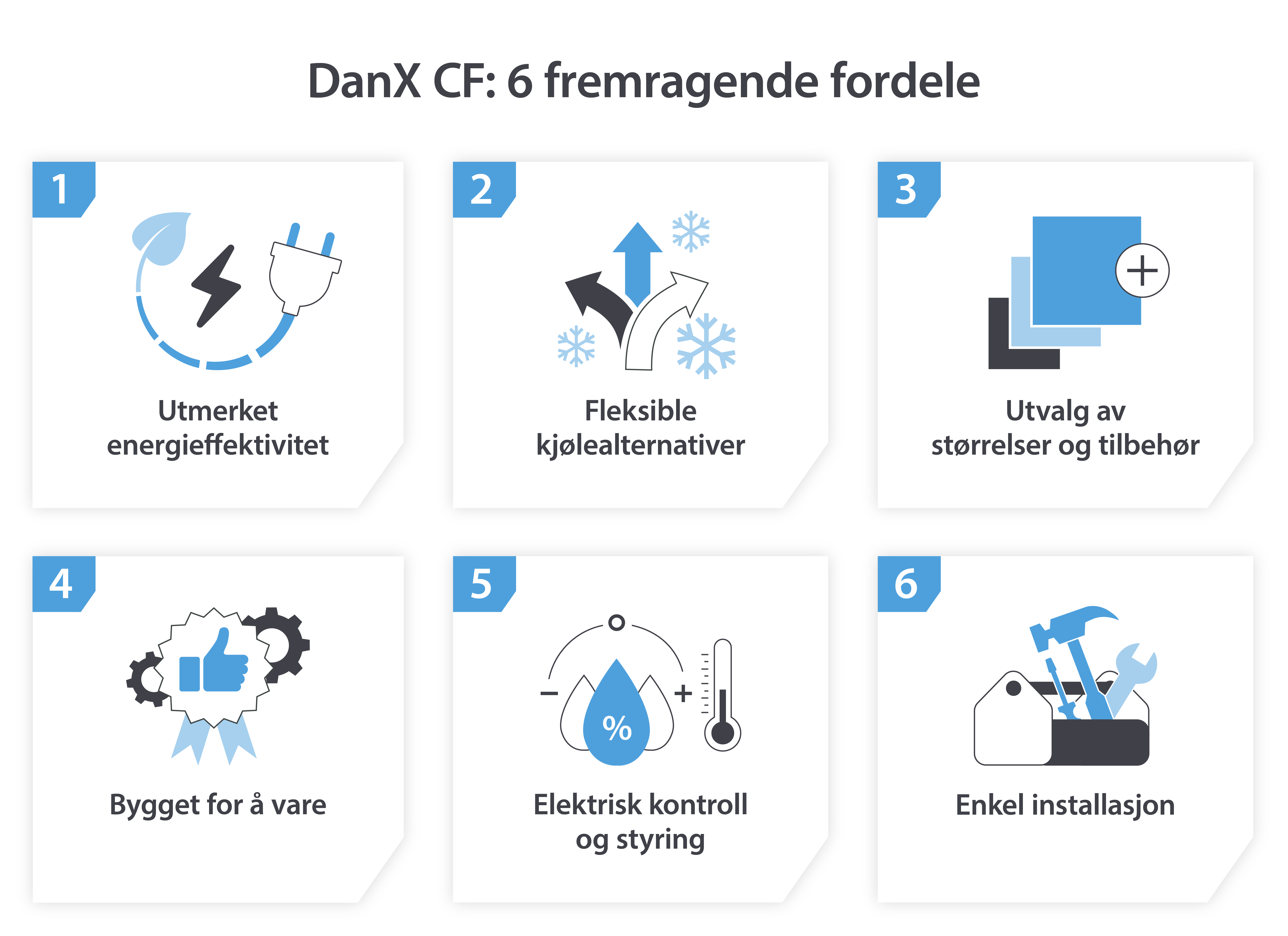 For å demonstrere mulighetene i vårt nye DanX CF luftbehandlingsaggregat, har vi laget en oversikt over 6 enestående funksjoner som du bør være oppmerksom på: