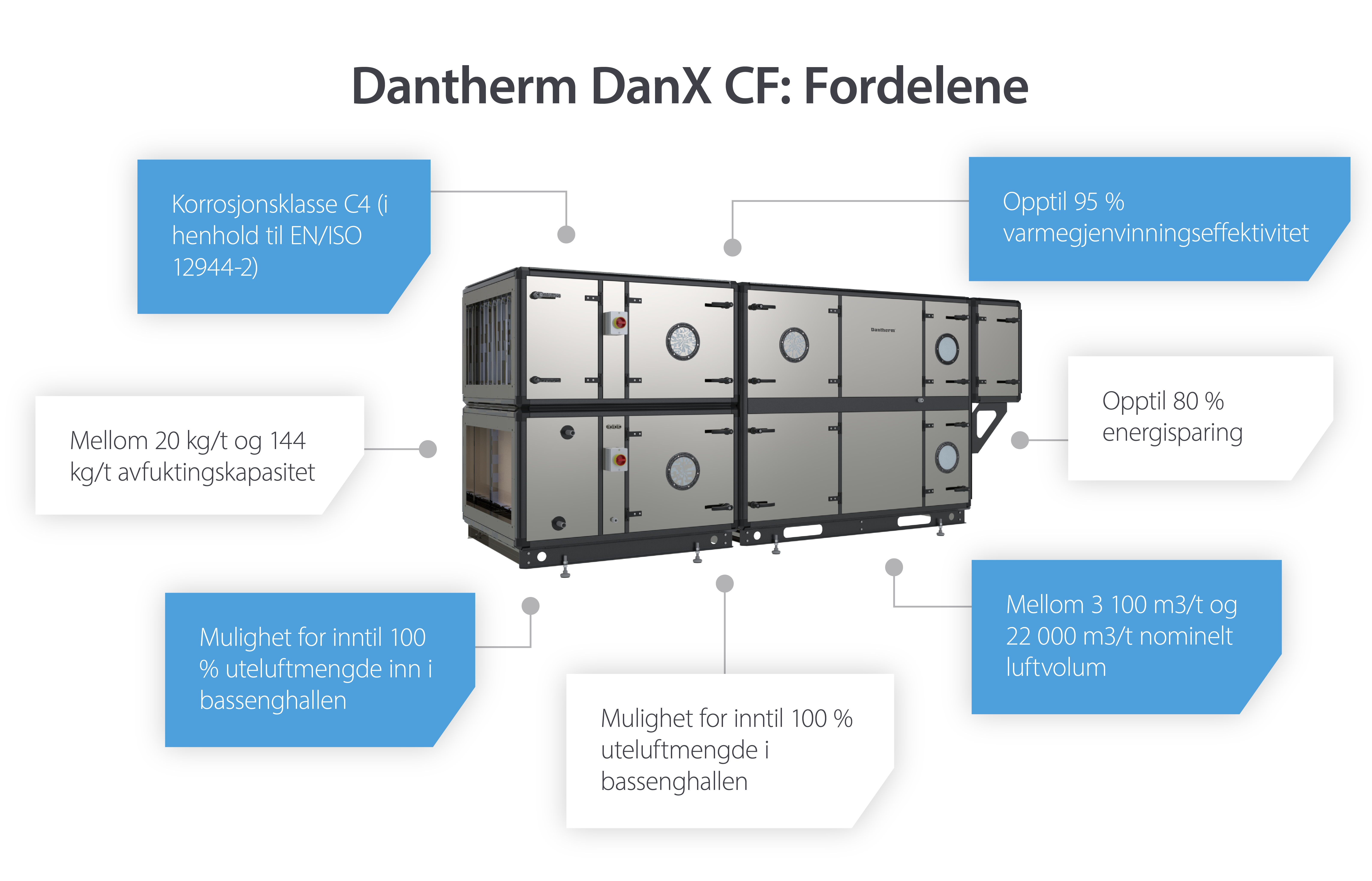 Muligheten for 100 % friskluftinntak gjør DanX CF-serien like egnet for terapibassenger og bassenger på hoteller eller spa, som den er for offentlige kommersielle bassenger.