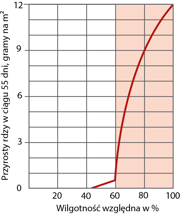 Przy wilgotności względnej wynoszącej co najmniej 60% szybkość korozji stali gwałtownie rośnie.