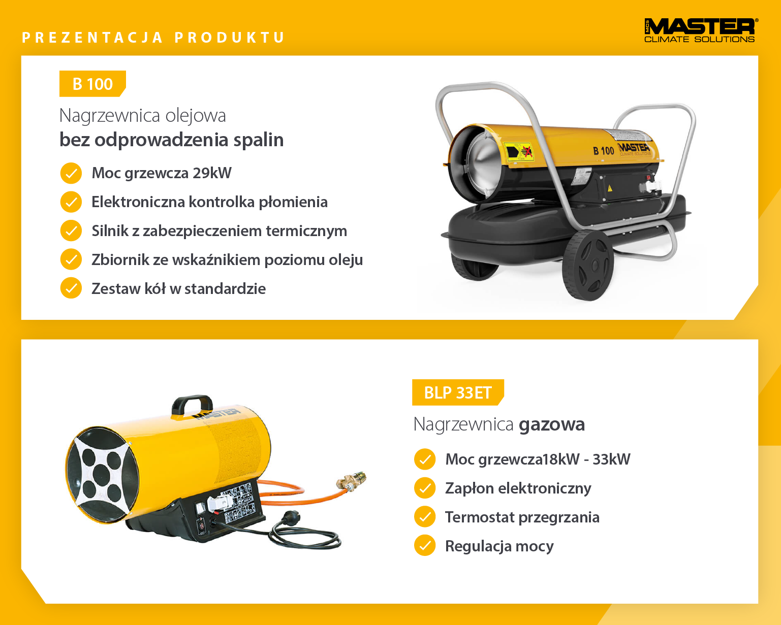 Rozwiązania Master zapewniają skuteczne, trwałe i przenośne urządzenia grzewcze zasilane olejem i gazem. Bez względu na pogodę nasze nagrzewnice mogą poprawić jakość pracy personelu przy niższych kosztach i z korzyścią dla środowiska.