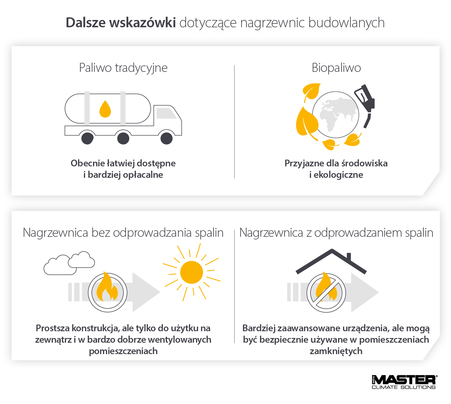 Wraz z upływem czasu na placach budowy zmieniają się również potrzeby związane z pracownikami i budową. Zastosowanie nagrzewnic z lub bez odprowadzenia spalin w pierwszej fazie projektu nie musi być odpowiednie dla drugiej fazy.