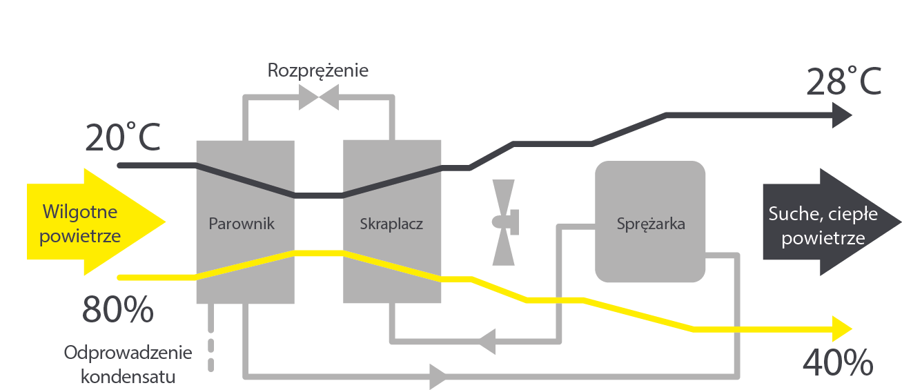 Ciepłe, suche powietrze jest następnie zwracane do pomieszczenia o wymaganej wilgotności