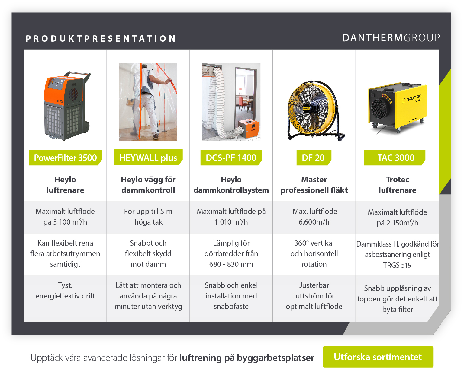 Dantherm Group är Europas främsta leverantör av teknik för dammkontroll: från praktiska luftskrubbrar till lättanvända dammskyddsväggar. Våra luftreningslösningar är betrodda över hela världen och används i otaliga projekt.