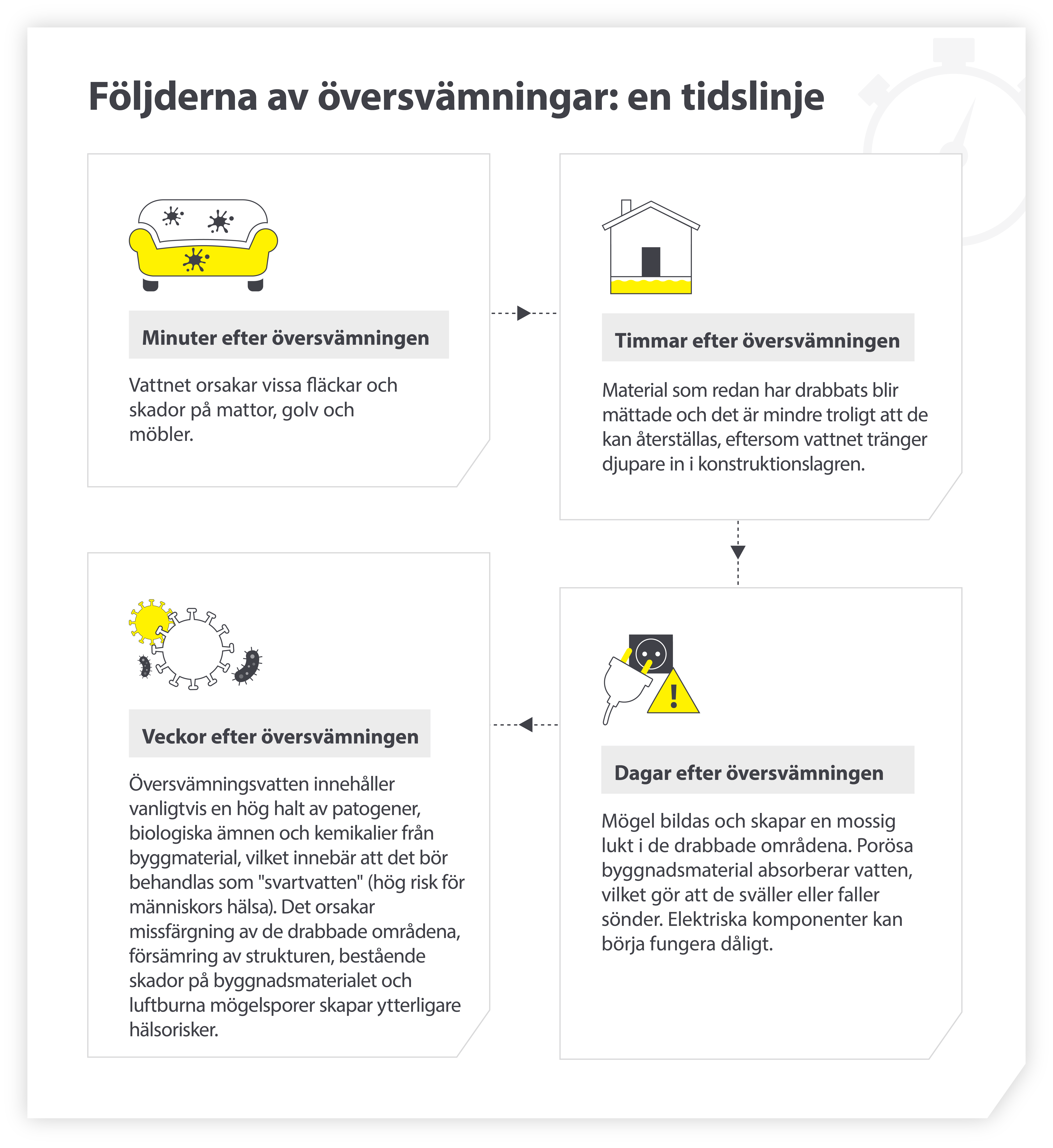 Konsekvenserna av en översvämning sträcker sig långt bortom den initiala händelsen. Vattenskador som inte åtgärdas kan ha en förödande inverkan på byggnader och de boende om de tillåts utvecklas okontrollerat. Därför är arbetet med att återställa vattenskador en absolut nödvändighet efter en översvämning.