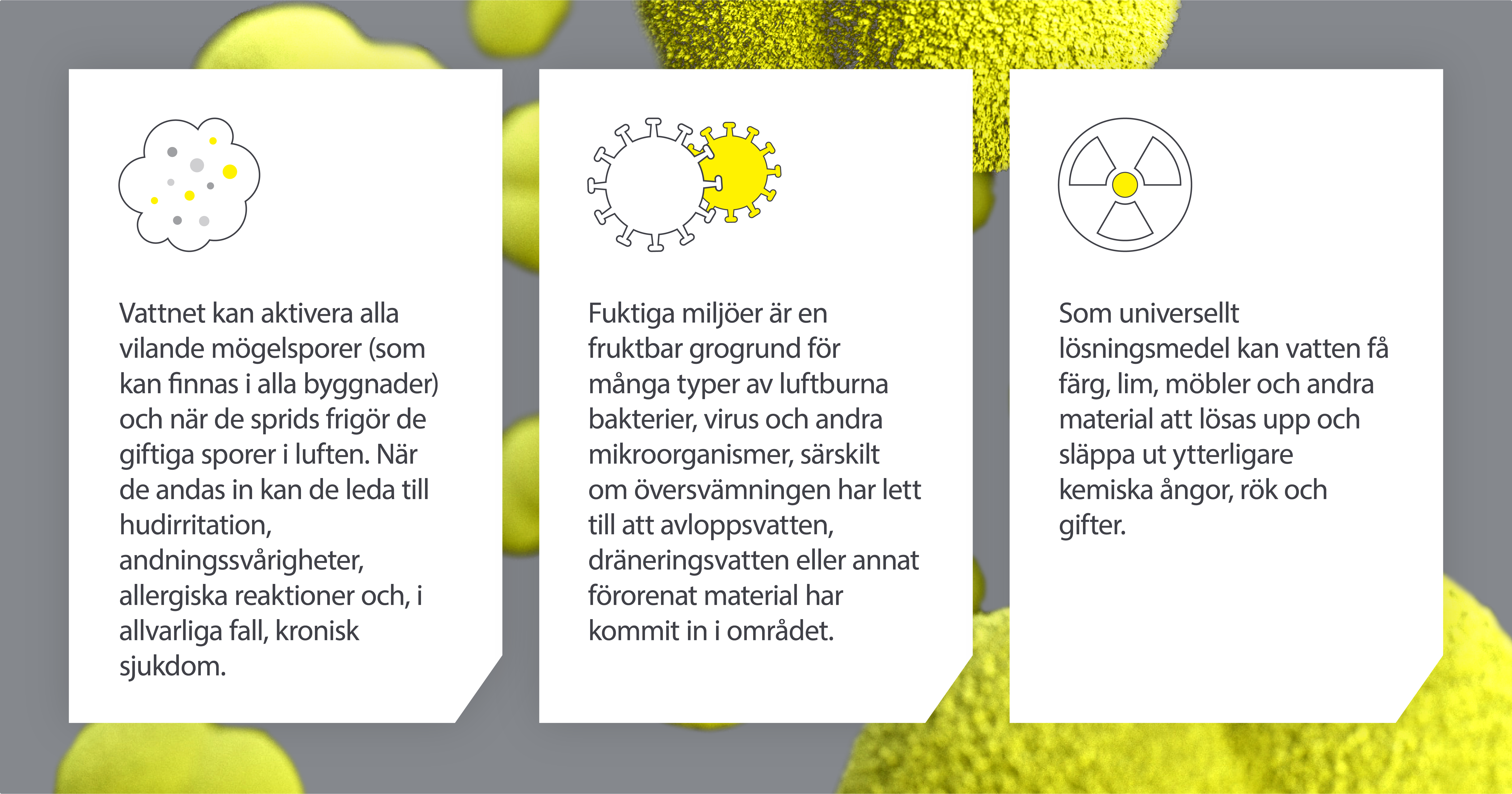 Ju längre tid fukten får på sig att tränga in i möbler och byggmaterial, desto större blir risken för mögelspridning. När detta sker kan gifter, bakterier och patogener snart komma ut i atmosfären och på några dagar eller veckor blir området en betydande hälsorisk. Efter en översvämning är fastigheten nästan säkert kraftigt förorenad av översvämningsvattnet redan från början.