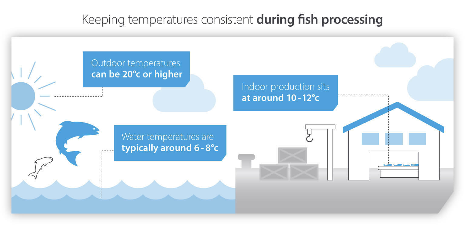 While the majority of fisheries remain at sea, the industry is still facing challenges when it comes to achieving consistent indoor climates during the different stages of processing. Ensuring that temperatures, humidity and air quality is calculated and maintained correctly is paramount to hygiene, food quality and processing efficiencies.