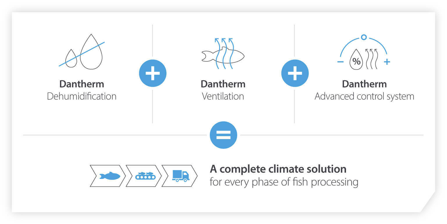 In fish factories, there tends to be high usage of cooling equipment which generates a lot of heat. What the Dantherm desiccant dehumidifiers, Dantherm control and DanX systems do is take this heat and reuse it to avoid waste and maximise energy preservation.