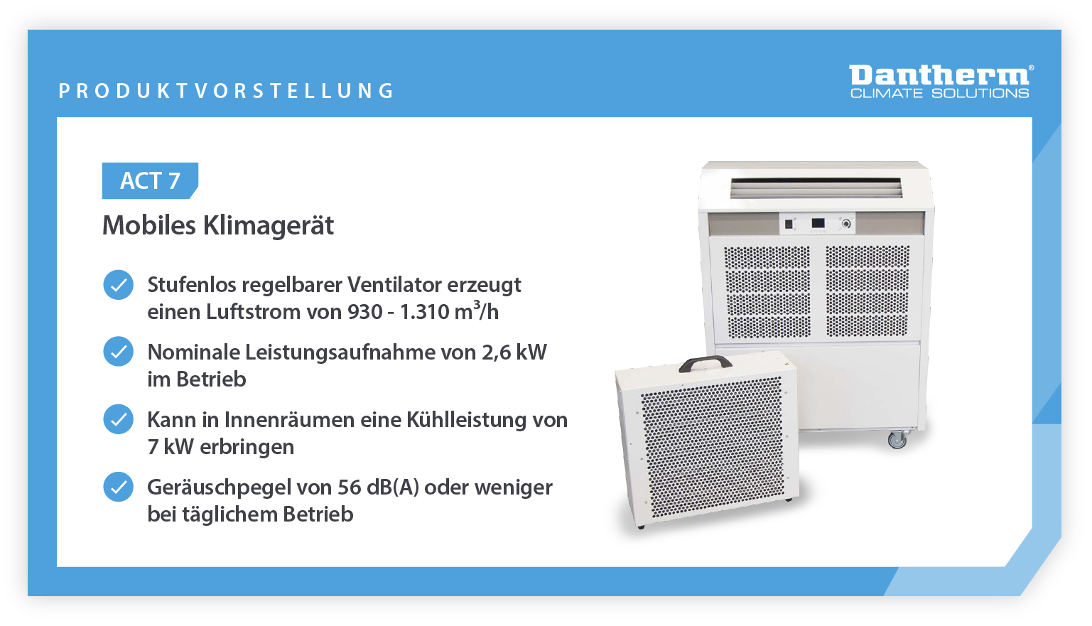 - Denn ACT 7 ist eine schnelle, effektive und kosteneffiziente Lösung, die innerhalb von Minuten eingesetzt werden kann, um einen Raum zu kühlen.