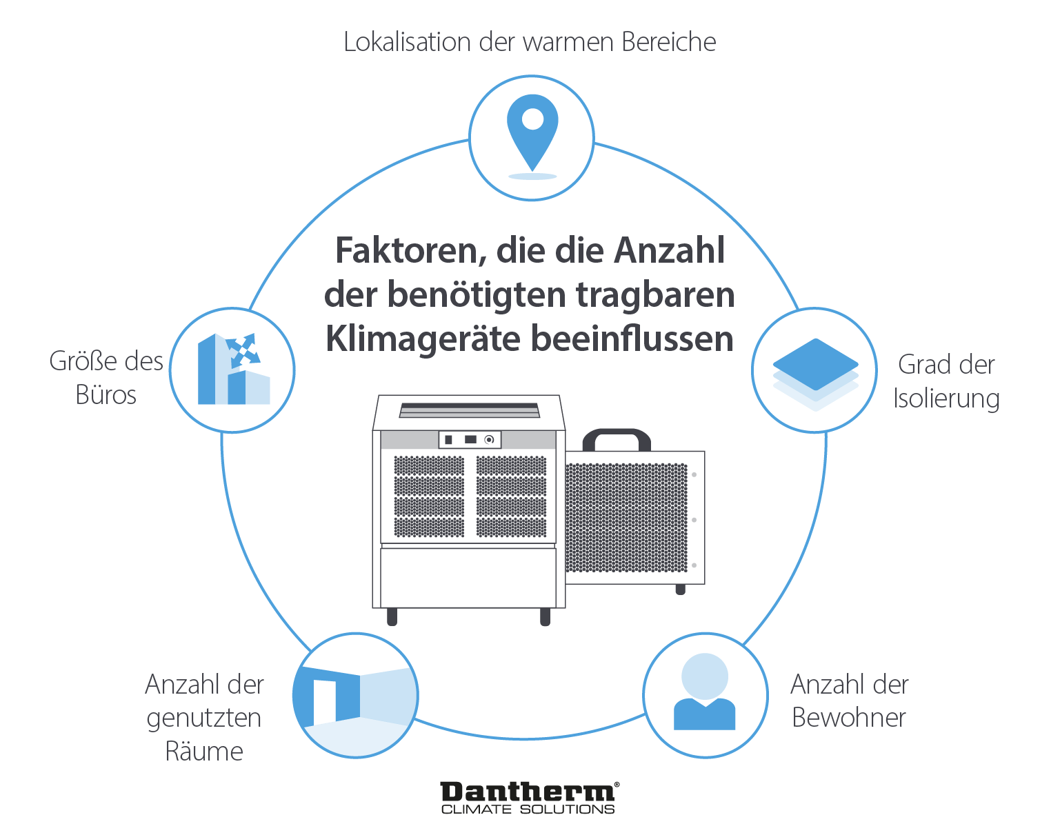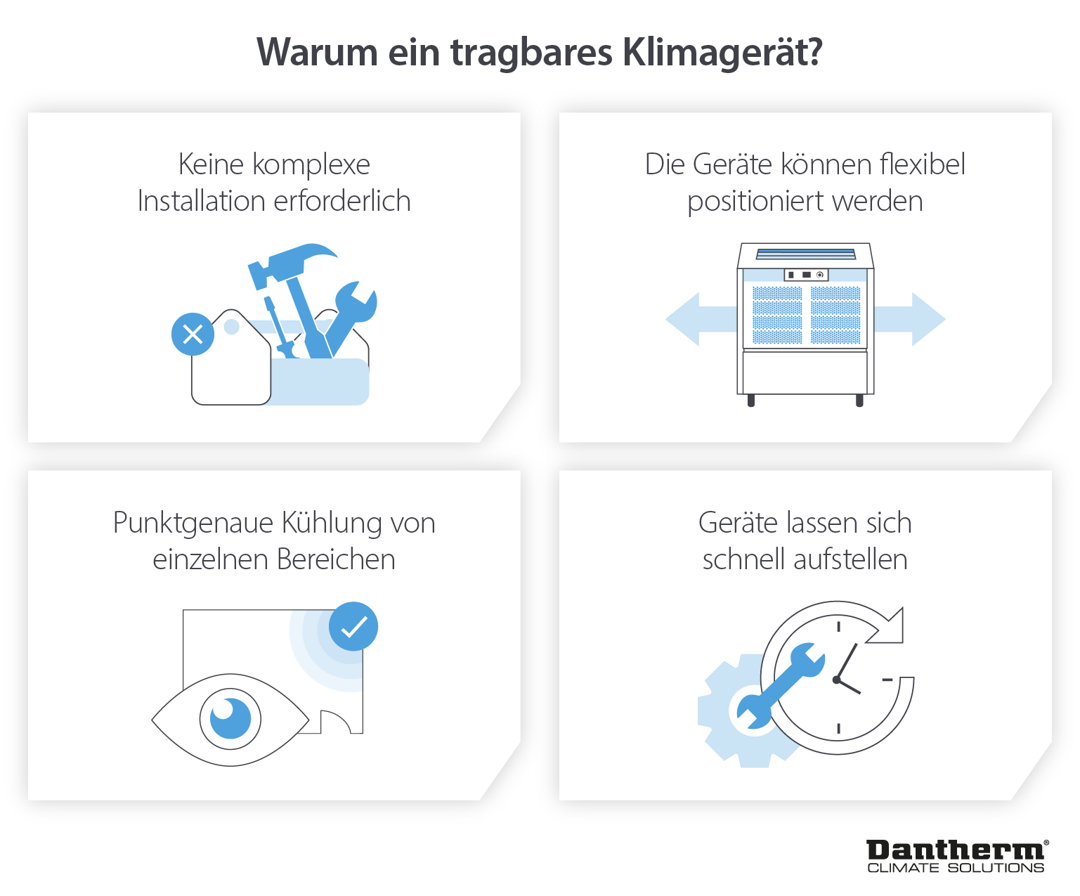 Tragbare Klimageräte wie der ACT 7* sind schnelle und einfach zu bedienende Lösungen für die Raumkühlung. Diese Systeme sind in wenigen Augenblicken einsatzbereit und können als vorübergehende Lösung in Büros eingesetzt werden, um in jeder Situation angenehme klimatische Bedingungen zu gewährleisten.