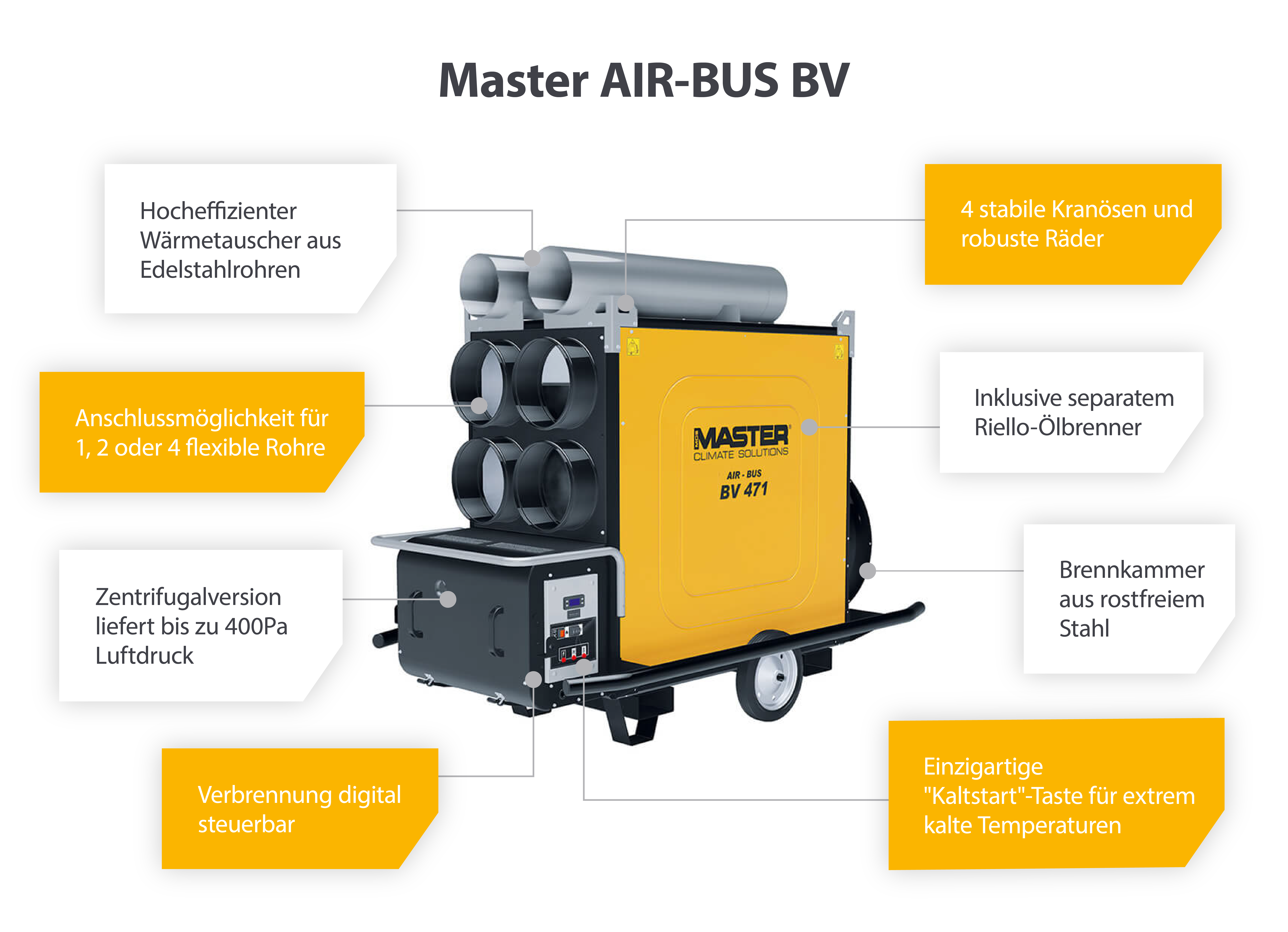 Die Master BV-Reihe setzt auf hochwertige Materialien, um ein Maximum an Zuverlässigkeit zu erreichen. Beispielsweise ist die Brennkammer, eine der wichtigsten Komponenten eines Lufterhitzers, aus Edelstahl gefertigt. Dadurch bleibt die Leistung der Kammer über einen äußerst langen Zeitraum erhalten, was den Komfort der Bewohner aufrechterhält und den Bedarf an Ersatzteilen minimiert.