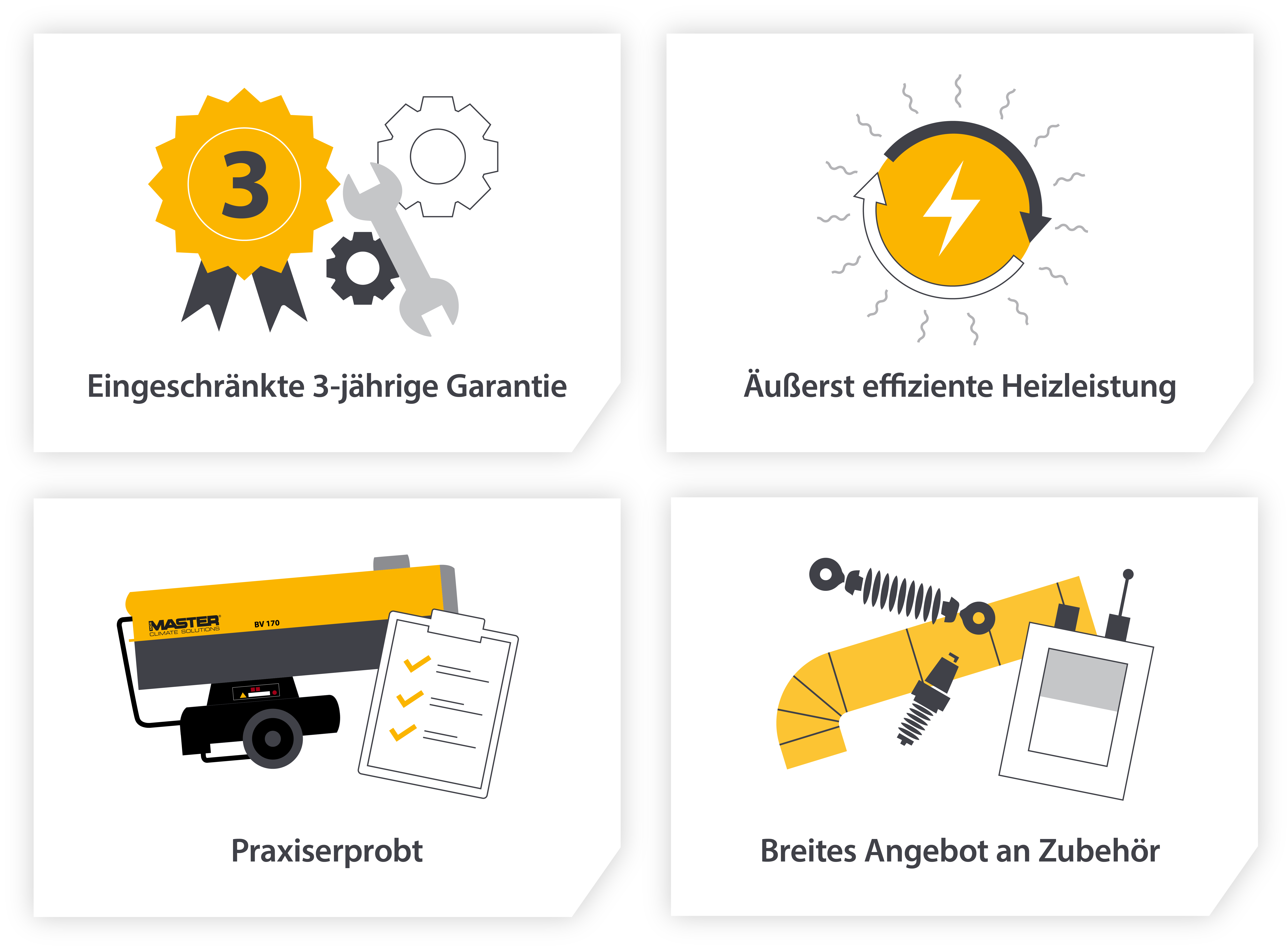 Hier ist die weltweite Präsenz von Master für unsere Kunden von unschätzbarem Wert. Mit Händlern und Servicestellen auf der ganzen Welt sowie einer umfassenden Verfügbarkeit von Ersatzteilen und Verbrauchsmaterialien können alle Probleme schnell behoben werden. Keine Verzögerungen, keine anhaltenden Probleme für Bereiche, die beheizt werden müssen.