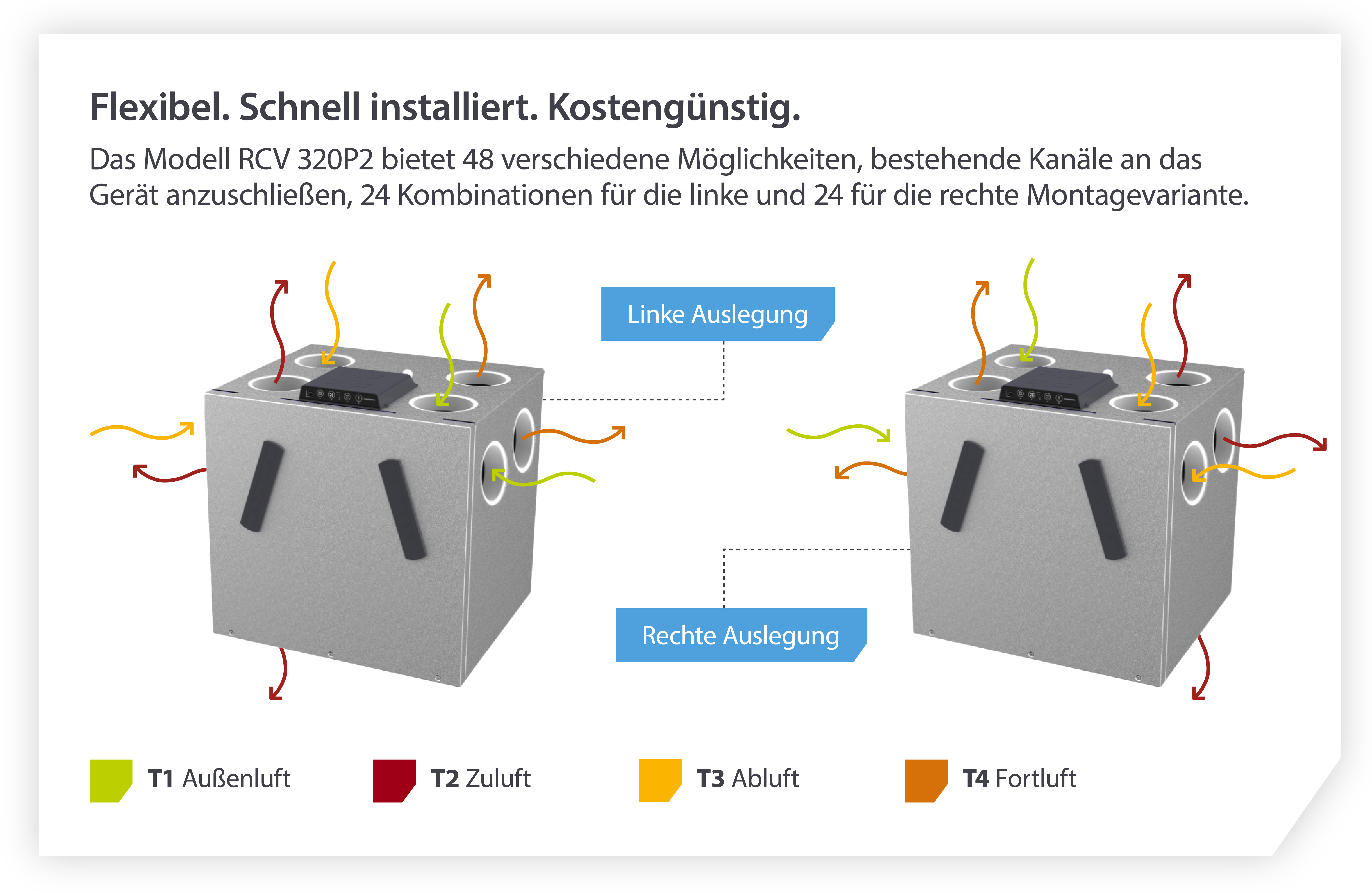 Im Gegensatz zu anderen Produkten auf dem Markt bietet das RCV 48 Anschlussmöglichkeiten für Kanäle. Das bedeutet, dass bestehende Kanäle nicht neu verlegt werden müssen und einfach installiert werden können. Die Einheit kann links oder rechts angeordnet werden und verfügt über jeweils 24 Kombinationsmöglichkeiten Leitungen anzuschließen.