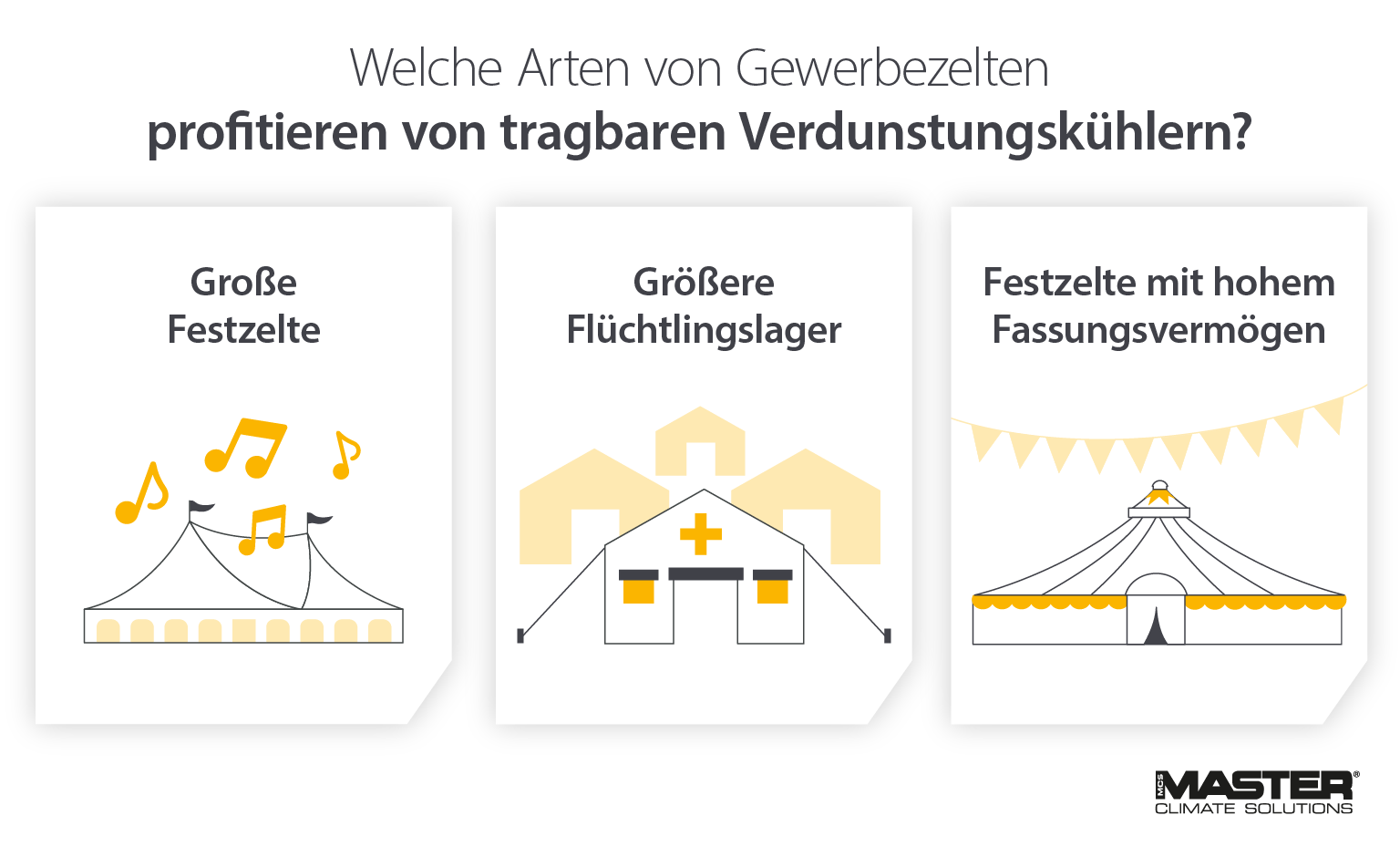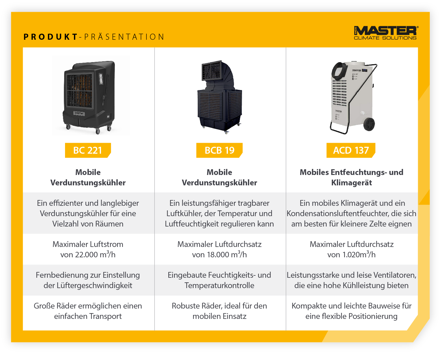 Die Verdunstungsgeräte von Master sind nicht nur selbst sehr leistungsfähige Kühlgeräte, sondern auch die optimale Wahl für die Kühlung von Gewerbezelten, denn: