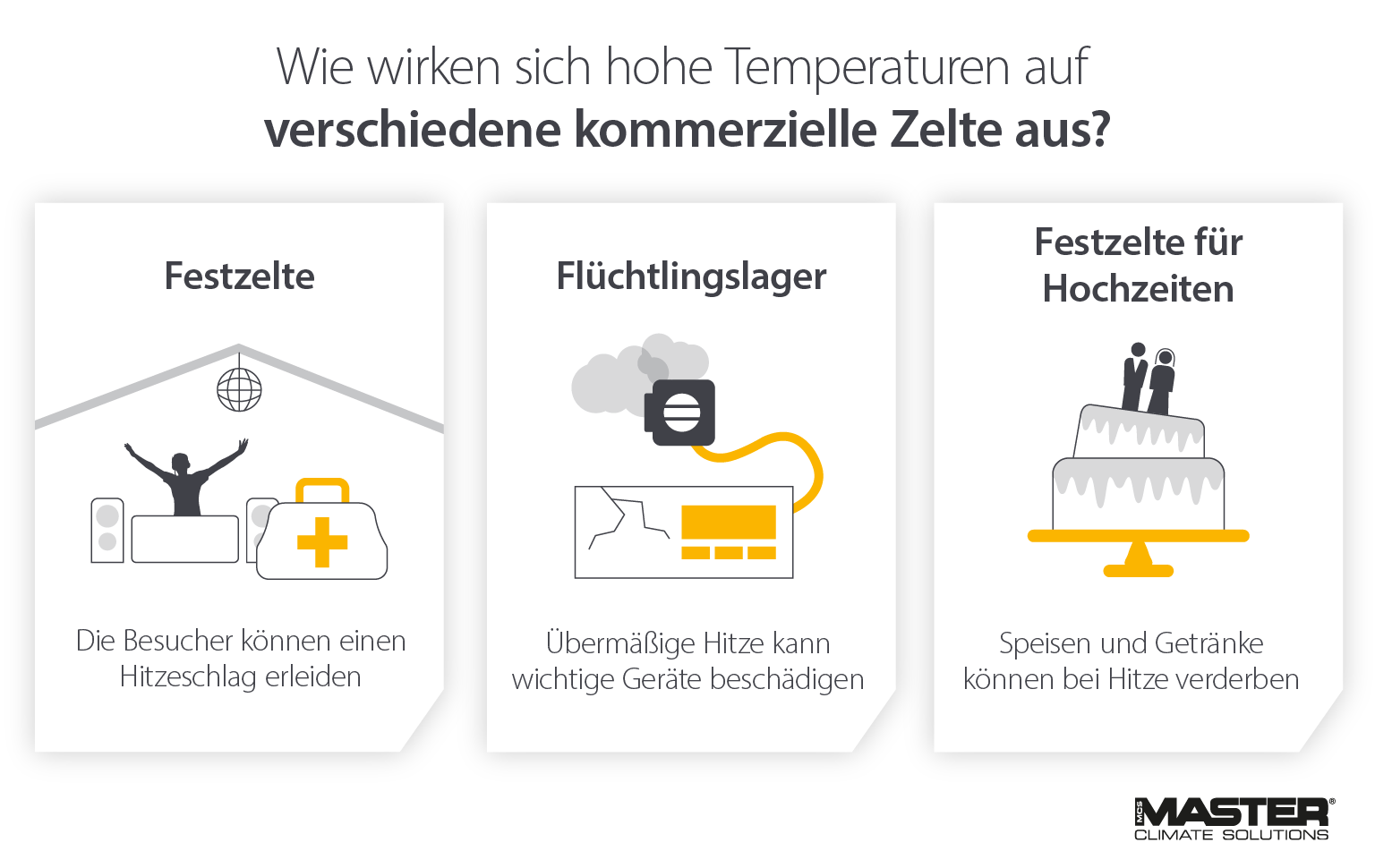 Zelte bieten zwar den dringend benötigten Schatten für beispielsweise Personal, Veranstaltungsgäste oder Flüchtlinge, können sich aber an heißen Tagen schnell aufheizen. In diesem Artikel erörtern wir verschiedene Möglichkeiten, wie die Bedingungen in Gewerbezelten kontrolliert werden können.