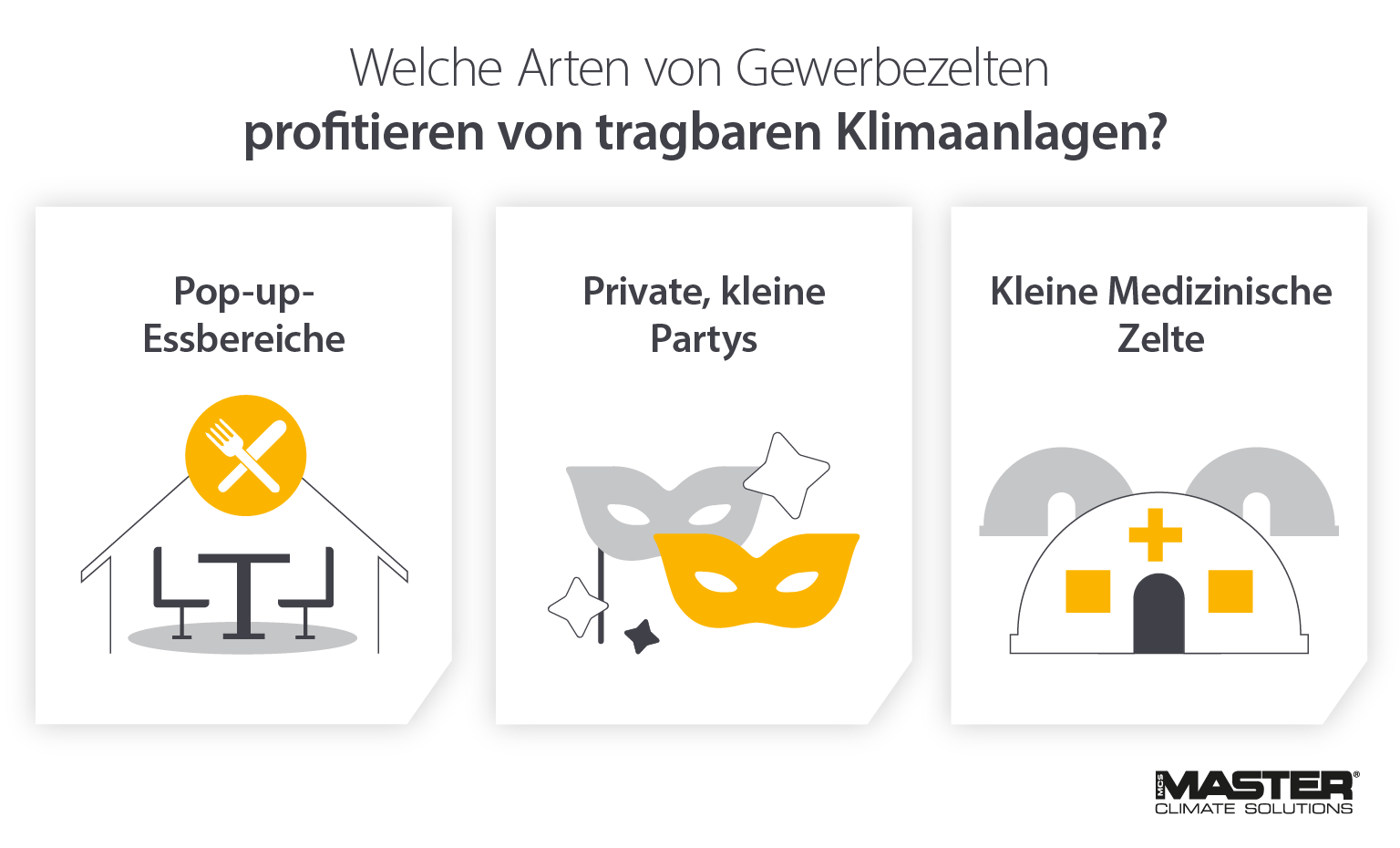 Obwohl Verdunstungskühler oft die effektivste Wahl für die Kühlung von Festzelten sind, eignen sie sich nicht für jeden Raum. Wenn es auf eine genaue Temperatureinstellung ankommt, können Klimageräte eingesetzt werden, die in kleineren und wettergeschützten Zelten für Kühlung sorgen.