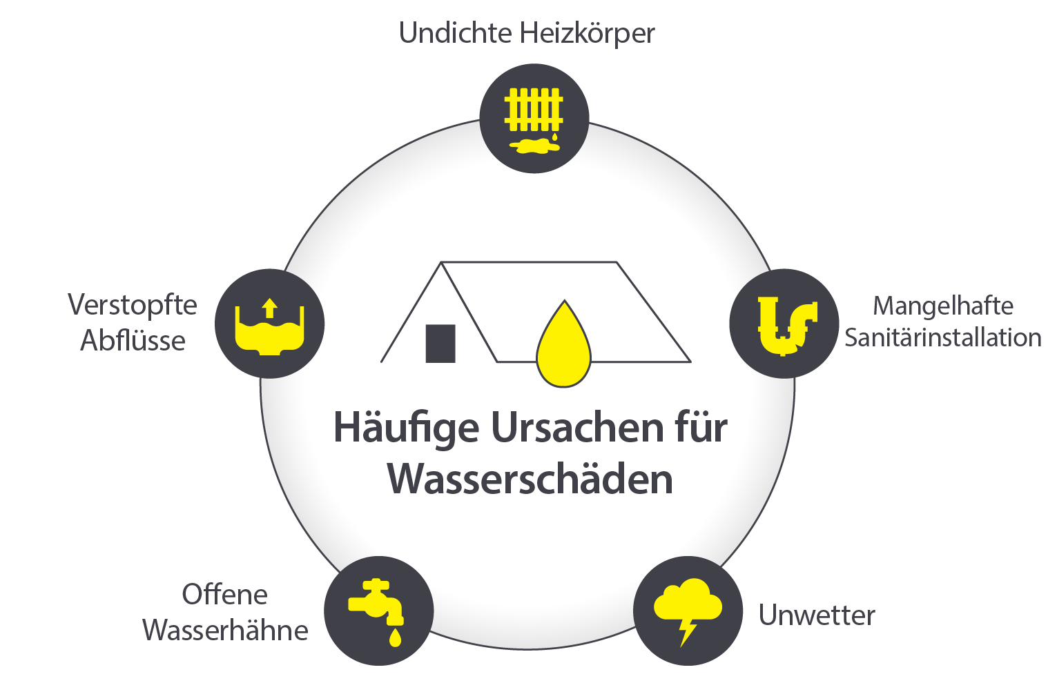 Bei starkem Regen oder Überschwemmungen kann Feuchtigkeit von außen in ein Gebäude eindringen. Wasserschäden können aber auch aus dem Inneren des Gebäude selbst stammen.