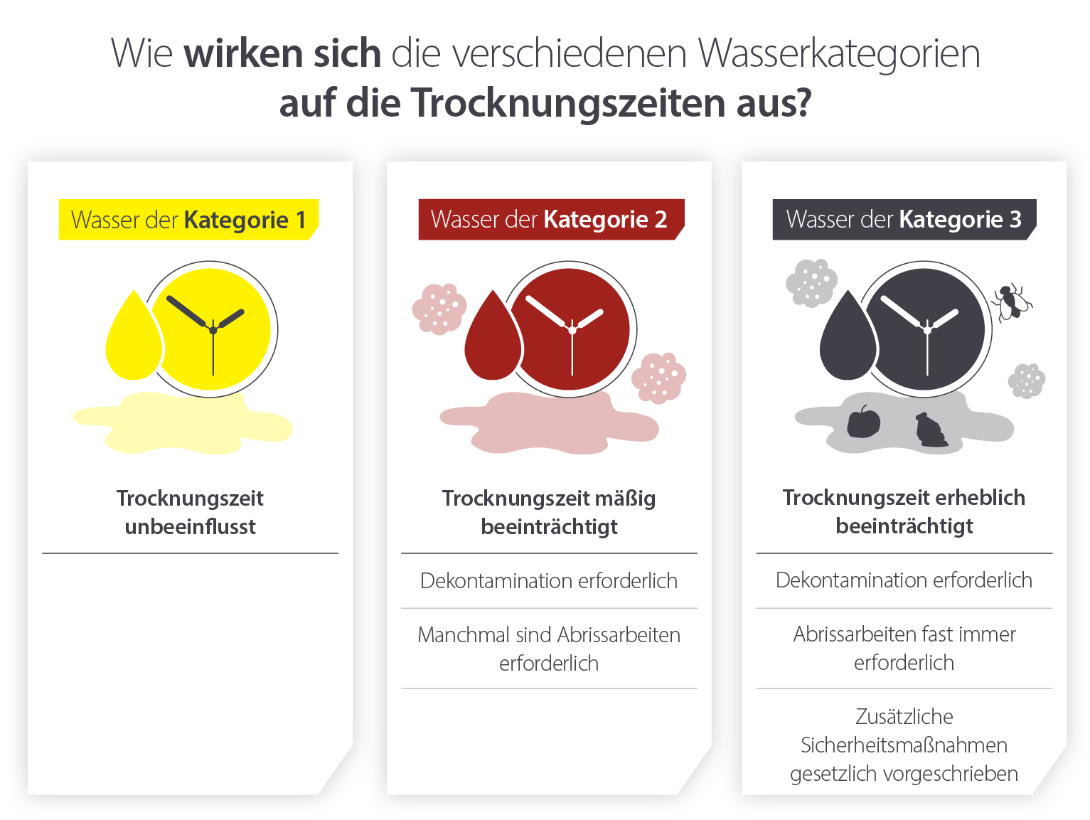 Natürlich ist nicht nur das Wasservolumen zu berücksichtigen, sondern auch die Klassifizierung des Wassers hat Einfluss auf die Schwere der erforderlichen Maßnahmen sowie auf die Zeit und die Ressourcen, die für die Durchführung der Trocknungsarbeiten erforderlich sind.