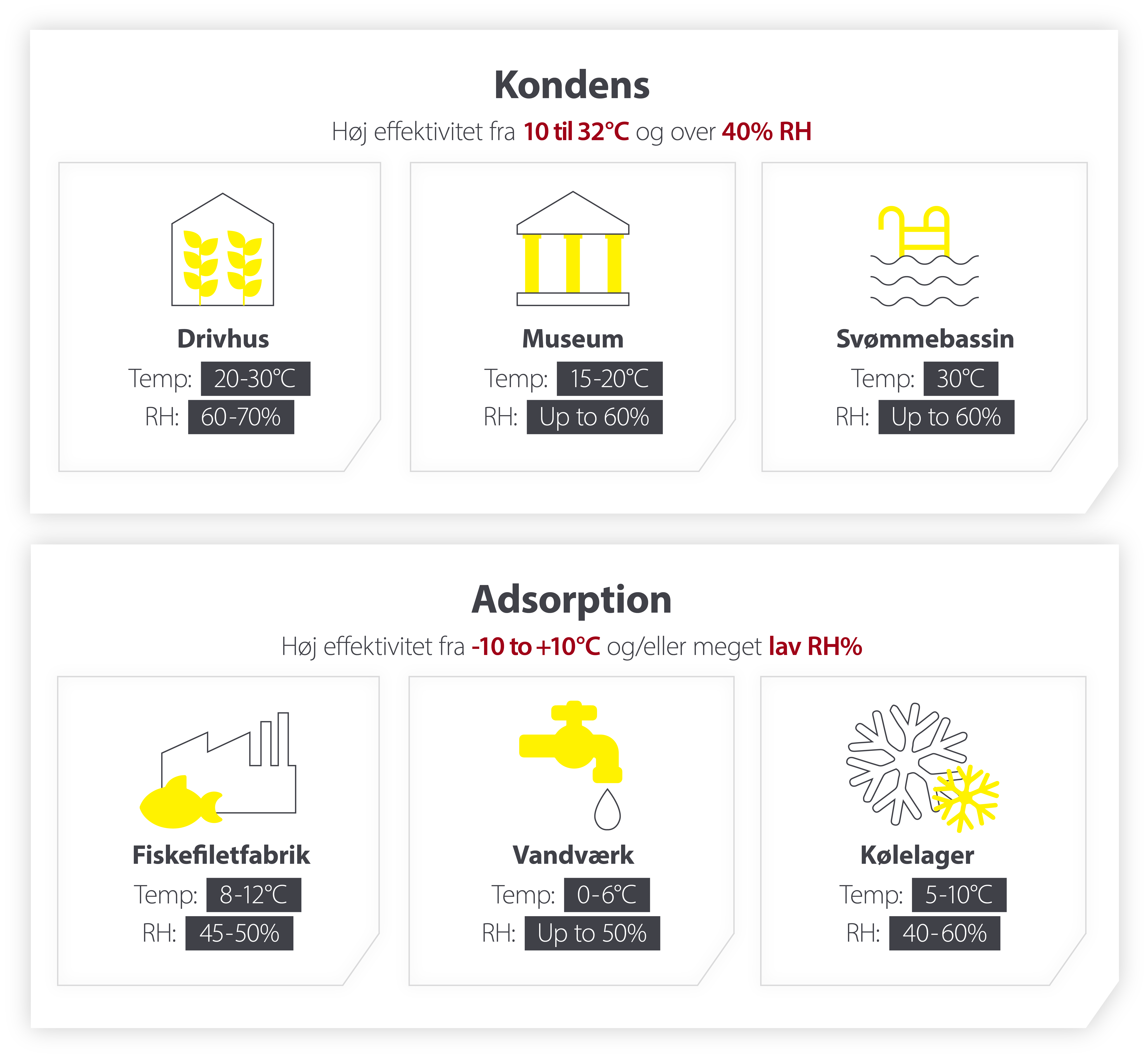 Derfor starter vi altid med temperaturen og det ønskede RL-niveau. Nedenfor er der nogle almindelige eksempler på, hvordan temperatur og relativ luftfugtighed kan afgøre dit valg af teknologi:
