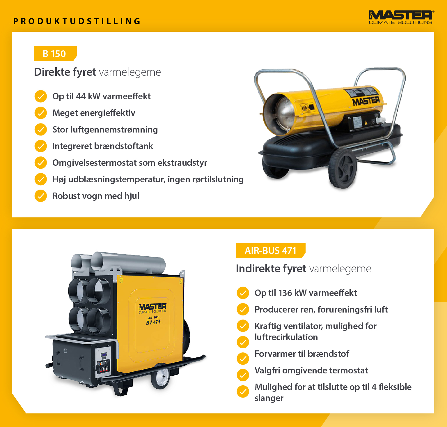 Master er et velkendt navn inden for transportable klimastyringsløsninger. I løbet af de 60 år, der er gået, siden vi blev grundlagt, har vi udviklet en række robuste direkte og indirekte fyrede varmeapparater, der fokuserer på driftssikkerhed, holdbarhed, effektivitet og brugervenlighed.
