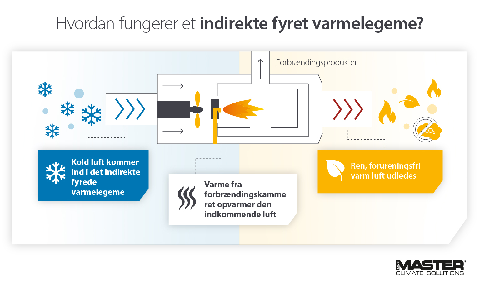 Mens direkte varmeapparater muliggør direkte kontakt mellem ild og luft, er flammen indesluttet i et lukket forbrændingskammer i et indirekte varmeapparat. Varmen i dette kammer føres til den luft, der passerer igennem via en varmeveksler, hvilket sikrer, at ilden aldrig rører ved eller reagerer med afkastluften.